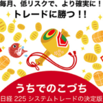 『うちでのこづち』とは、エクセルを使って日経225先物の売買サインを判定するシステムトレードです。この『うちでのこづち』の出した売買サインにしたがって取引するだけで、毎月165,000円を労せずして手に入れることができます。 これは日経225先物1枚の結果です。あなたがもし、日経225先物ラージ10枚で取引するなら、毎月1,650,000円を稼ぐチャンスがあるということです。 作業時間は約5分。平日の朝にエクセルを少しだけ操作すれば完了です。 『でも、私はパソコンに詳しくないし、エクセルも操作できるかどうか。。。』と不安に思うかもしれません。でも心配は無用です。数値を入力(コピー・貼り付け)するだけであとはエクセルが自動的に判定してくれます。 作業内容はこれだけです。 1.エクセルファイルを起動します。 この成績を見ていただくと、他のシステムトレードと比べて、とても地味に感じるかもしれません。他のシステムトレードでは、過去5年間負けなし!とか、PF(プロフィットファクター)が驚異の3.5!とか、1か月で150万円稼げる!とか。ド派手な数字が並んでいます。 でも、そういうシステムトレードって運用していかがだったでしょうか。とてもじゃないですけど、公式サイトに書いている成績は実現できなかったのではないでしょうか? 多くのトレードシステムはこのような派手な成績を作り上げるために、難しく複雑な計算ロジックを組んでいます。複雑な計算ロジックは、ハマれば強いですが合わない相場は徹底的に合いません。販売されたとたんに連敗を繰り返し、使い物にならなくなるシステムトレードがあるのはこういう理由です。(もちろんしっかり考えられた優良なトレードシステムもあります。) 『うちでのこづち』はすごくシンプルな計算ロジックを使っています。だからこそ、成績自体は地味ですが、どんな相場にも対応できる、汎用性の高いシステムトレードに仕上がっています。 参入率(見送り以外の売買サインが出る確率)も無理に高くしていません。むりやり売買サインを表示することは可能です。でも、その場合、成績も悪くなります。参入率が低いと面白みやスリルはありません。でも、投資で大事なのは面白みやスリルではなく、実際の利益です。だからこそ、あえて無駄なトレードはしないように設計しています。 もしかすると毎月165,000円も稼げるということは、元手がかなりかかるんじゃないか?そう思われるかもしれません。日経225先物1枚で165,000円ですから、投資資金は100万円くらい用意したいところです。 ですが、もし100万円を準備できなくても問題ありません。日経225先物には「ミニ」という投資商品があります。ミニは日経225先物の10分の1の資金で投資ができます。10万円あれば日経225先物ミニ1枚で運用できますから、毎月16,500円の利益を見込めます。資金が増えたところで、ミニを2枚、3枚と増やしていけば、利益も大きくなってきます。 また、現在の金利と比較してみると圧倒的に利益率がいいということになります。大手銀行の普通預金は、利率が0.001%。定期預金でも0.01%程度です。10万円を預けたとして、1年後に利息として10円が手に入るだけです。月額にすると1円以下。そう考えると、日経225先物ミニ1枚で毎月16,500円の利益が出るというのはものすごい利益率ということが分かってもらえると思います。 同じ10万円で日経225先物ミニ1枚を運用すると16500倍の利益を得ることができます。 さらに、「複利運用」で雪だるま式に資産を増やしていくのもおすすめです。複利はあのアインシュタインが「人類最大の発明」と言ったと言われていますね。 例えば、最初20万円の資金で日経225先物ミニ1枚運用を開始したとします。そうすると、13か月目に運用資産は40万円を超えます。そこで、運用する枚数を2枚にします。すると、19か月目に約61万円になります。そこで3枚に増やします。 このように複利運用していけば、どんどん毎月の利益が増えていき、26か月目に資産が100万円を超えます。32か月目には毎月の利益が10万円を超えます。 日経225先物ミニ1枚での運用なら、毎月たった16,500円と思われるかもしれませんが、馬鹿にできません。 無理なく着実に利益を積み重ねていくことができる。それが『うちでのこづち』なのです! では、気になるお値段ですが。。。29,800円で提供させていただきます。Spider
