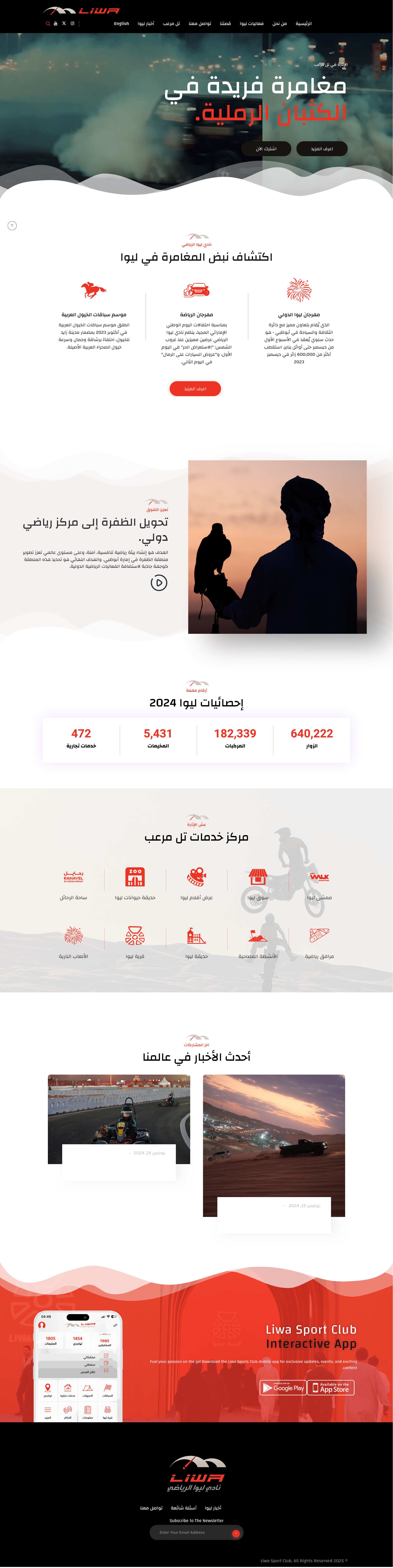 الإثارة في كثبان موريب الرملية. إقرأ المزيد انضم إلينا نادي ليوا الرياضي نبض مغامرات ليوا. مهرجان ليوا الدولي هو تعاون مميز مع دائرة الثقافة والسياحة في أبوظبي، وهو حدث سنوي من المقرر أن يقام في الأسبوع الأول من ديسمبر حتى أوائل يناير. اجتذب أكثر من 600000 زائر في ديسمبر 2023.