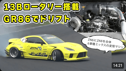 ガレージヤマグチさん製作の、6車種ミックスの変態マシンに試乗させていただきました。ZN6を改造していったら、いつの間にかほぼZN8になり、エンジンは13Bロータリーを積み、JZX100やマークX、Z32などメーカー不問でミックスされた、趣味の域を超えすぎたマシンです。乗り味は、味わったことのない不思議な感覚でした。