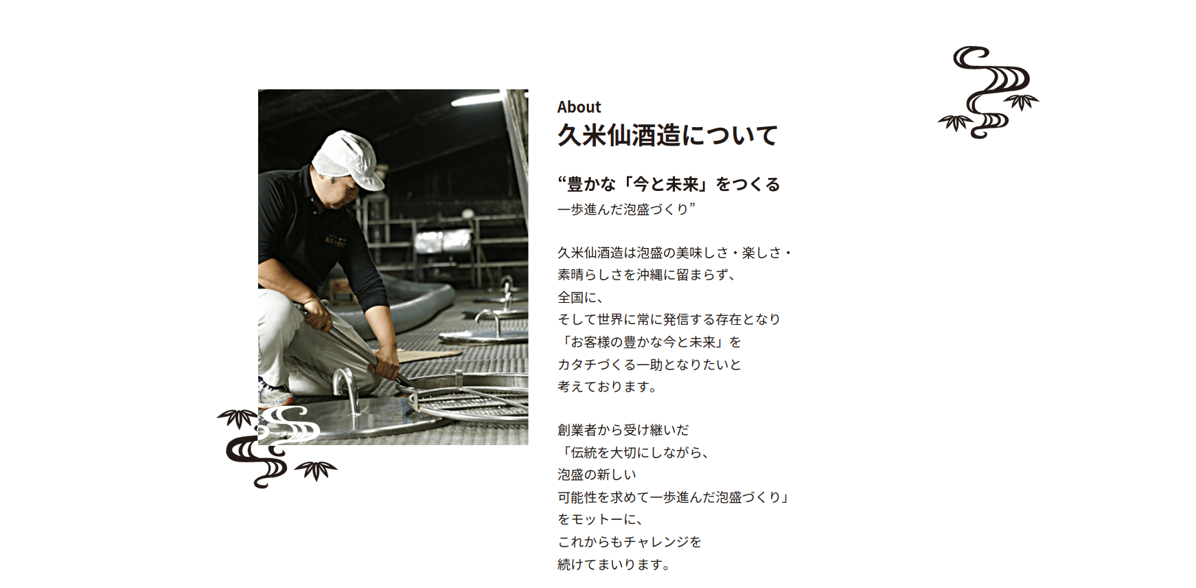 しかしながら、その素晴らしさが沖縄の若者のみならず、県外の方々にも知られていません。久米仙酒造はこの泡盛の美味しさ・楽しさ・素晴らしさを沖縄に留まらず、全国に、そして世界に常に発信する存在となり「お客様の豊かな今と未来」をカタチづくる一助となりたい。そう考えております。
