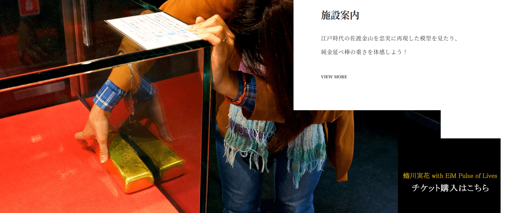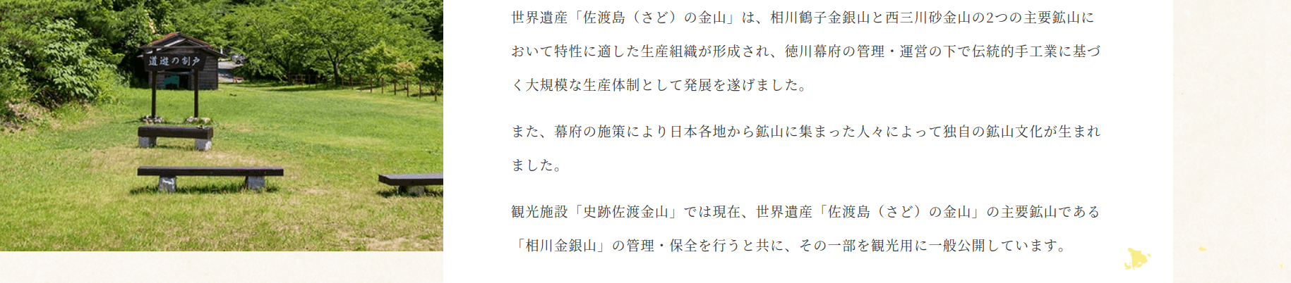 観光施設「史跡佐渡金山」では現在、世界遺産「佐渡島(さど)の金山」の主要鉱山である「相川金銀山」の管理・保全を行うと共に、その一部を観光用に一般公開しています。