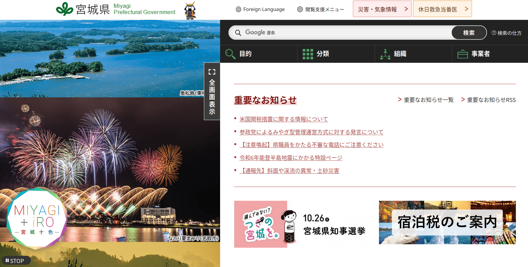 宮城県(みやぎけん)は、日本の東北地方に位置する県。県庁所在地は仙台市。県内人口は約225万人で(2023年9月1日の推計人口)、東北地方では最も人口が多い県である。人口約110万人の仙台市は東北地方の中心都市で、東北地方で唯一の政令指定都市及び100万都市である。仙台市は東北地方最大の仙台都市圏を形成し、宮城県民の67.9%に当たる154万人が仙台都市圏に居住する。 2025-10-09