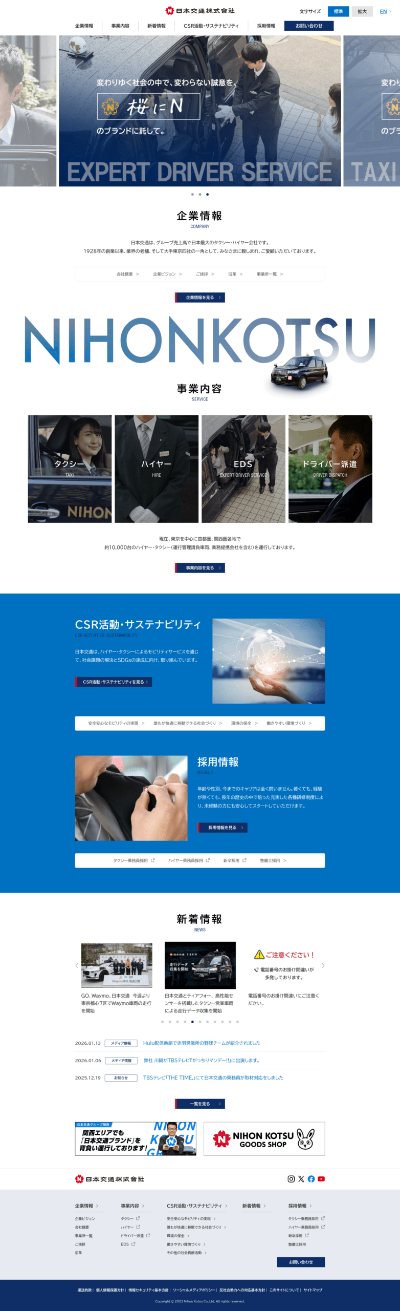日本交通株式会社(にほんこうつう、英: Nihon Kotsu Co.,Ltd.、略称:日交〈にっこう〉)は、東京都千代田区紀尾井町に本社を置くハイヤー・タクシー事業者。関係会社も含めたグループの売上高は同業で日本最大である。国際自動車、大和自動車交通、帝都自動車交通とともに東京四社営業委員会を構成している。タクシー事業において、同グループは8,082台(2024年(令和6年)5月時点)の車両を有し、国際自動車と並んで東京地区における最大手となっている。ロゴマークは「桜にN」の意匠で、タクシー車両の行灯などにも用いられている。 2026-01-17