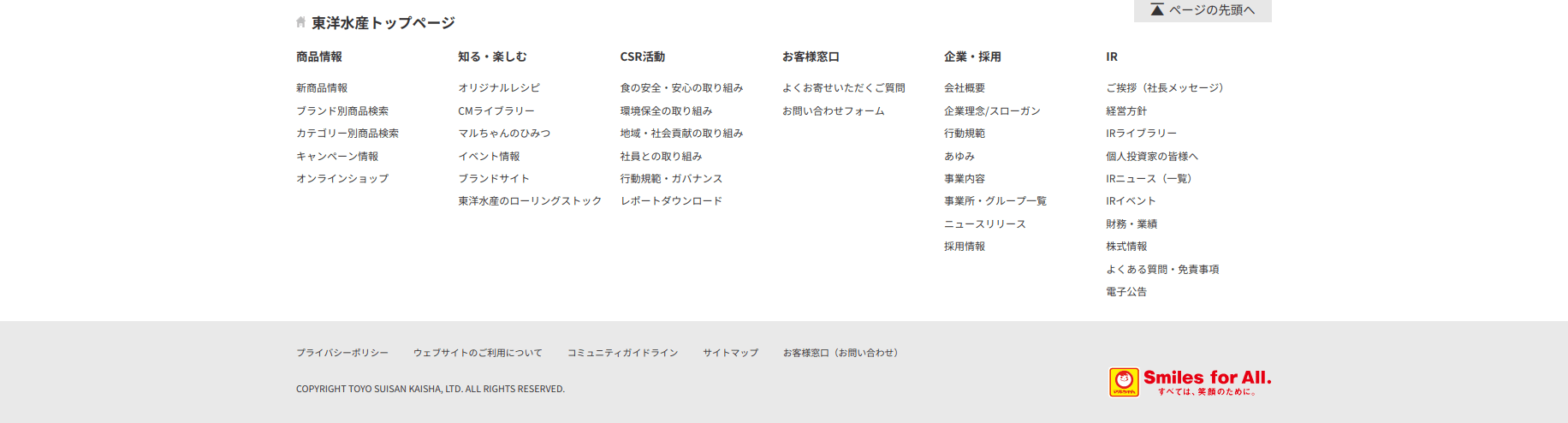 東洋水産株式会社は、東京都港区港南に本社を置く、日本の大手食品会社。「マルちゃん」のブランドで親しまれている。モットーは「やる気」と「誠意」。2009年3月に「Smiles for All. すべては、笑顔のために。」のコーポレートスローガンを制定した。 2025-10-31