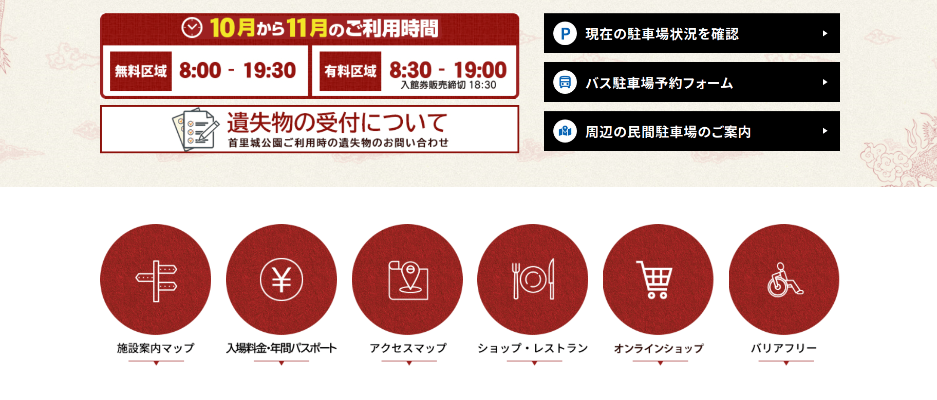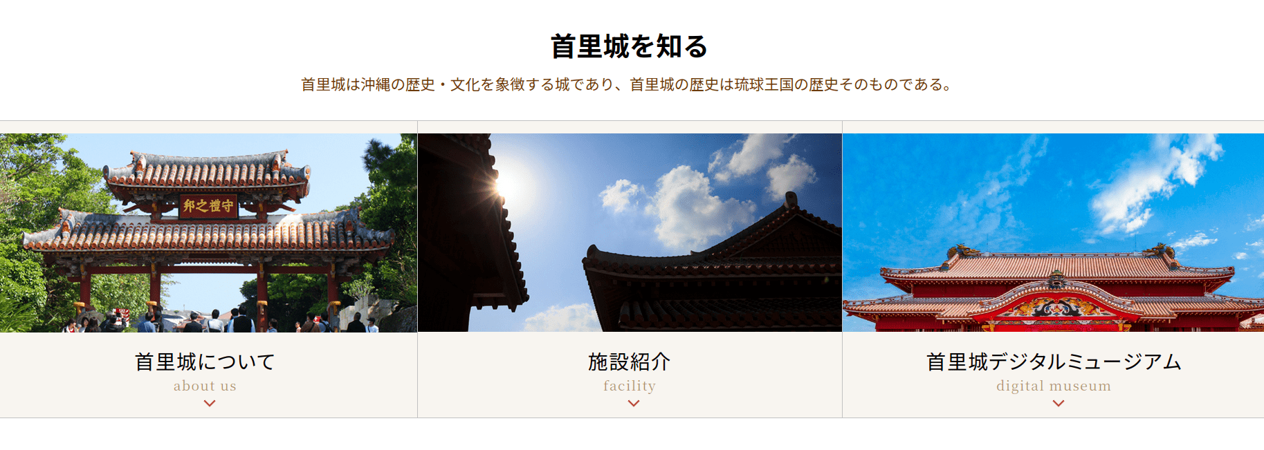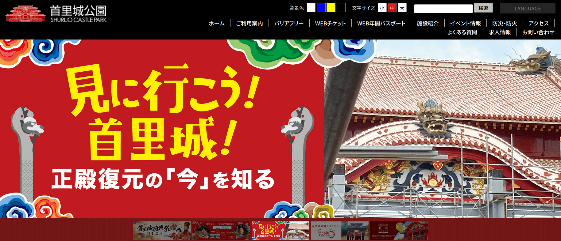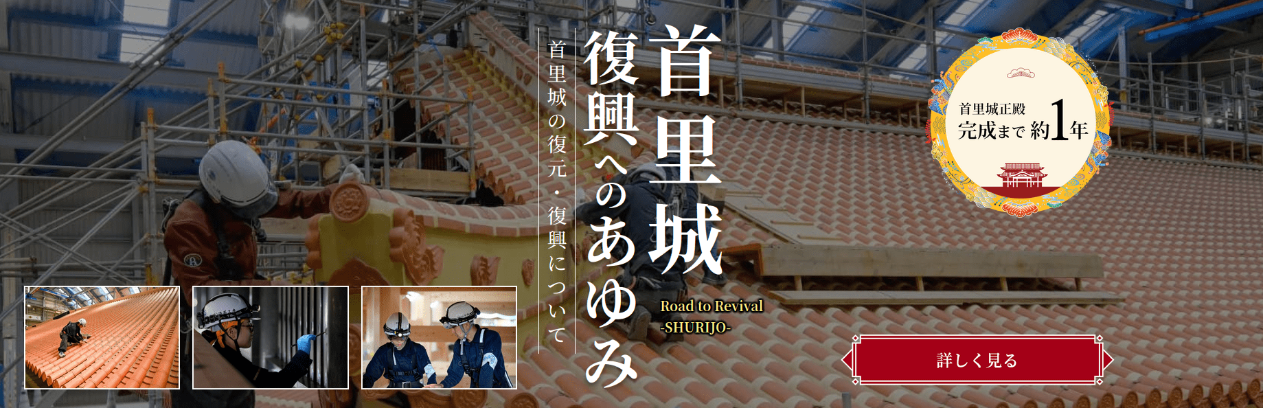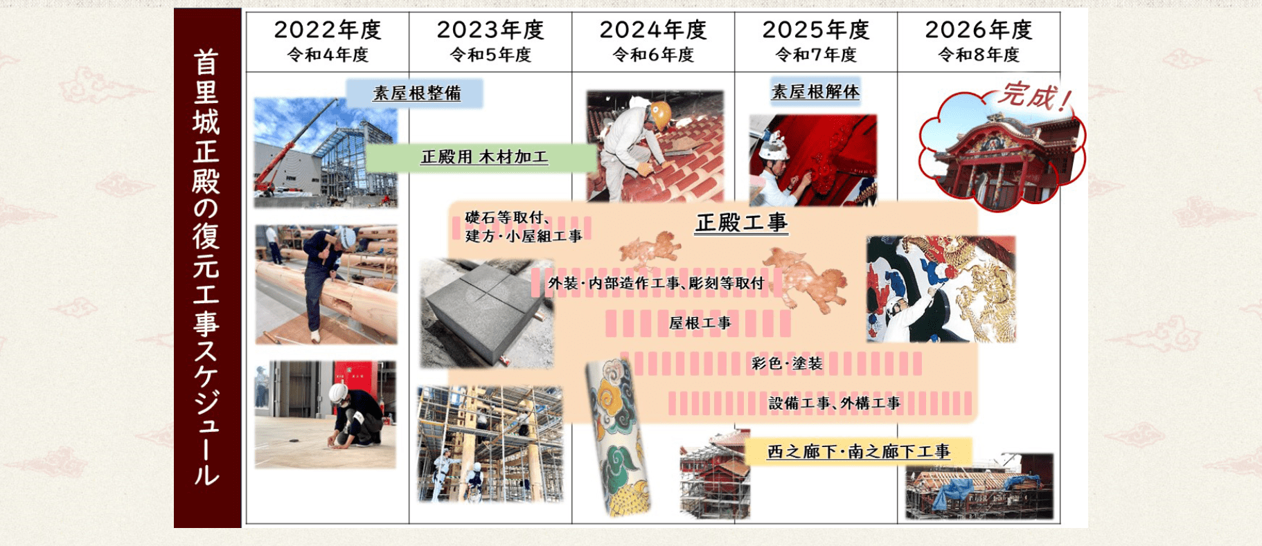 第二次世界大戦中に焼失後、1992年に柱・壁・瓦など朱色を基調として再建された。しかし、2019年10月31日に正殿など主要7棟が火災で焼失し、その後復旧作業が進められている。2026年秋に正殿の木造復元が完成する。その後、南殿、北殿、黄金御殿、二階御殿、番所、中城御殿等の木造復元をする予定である。