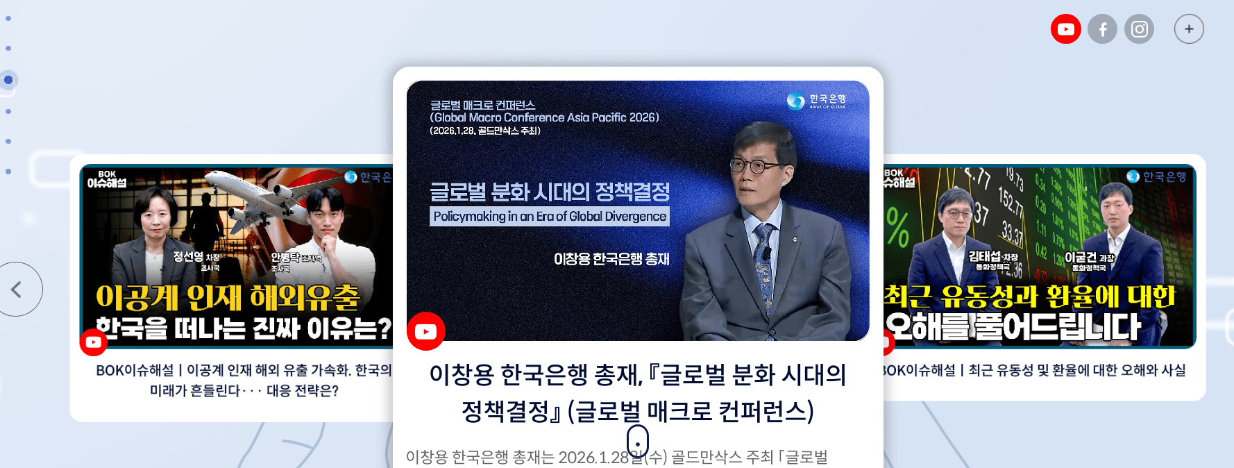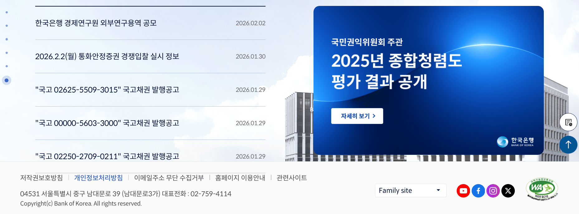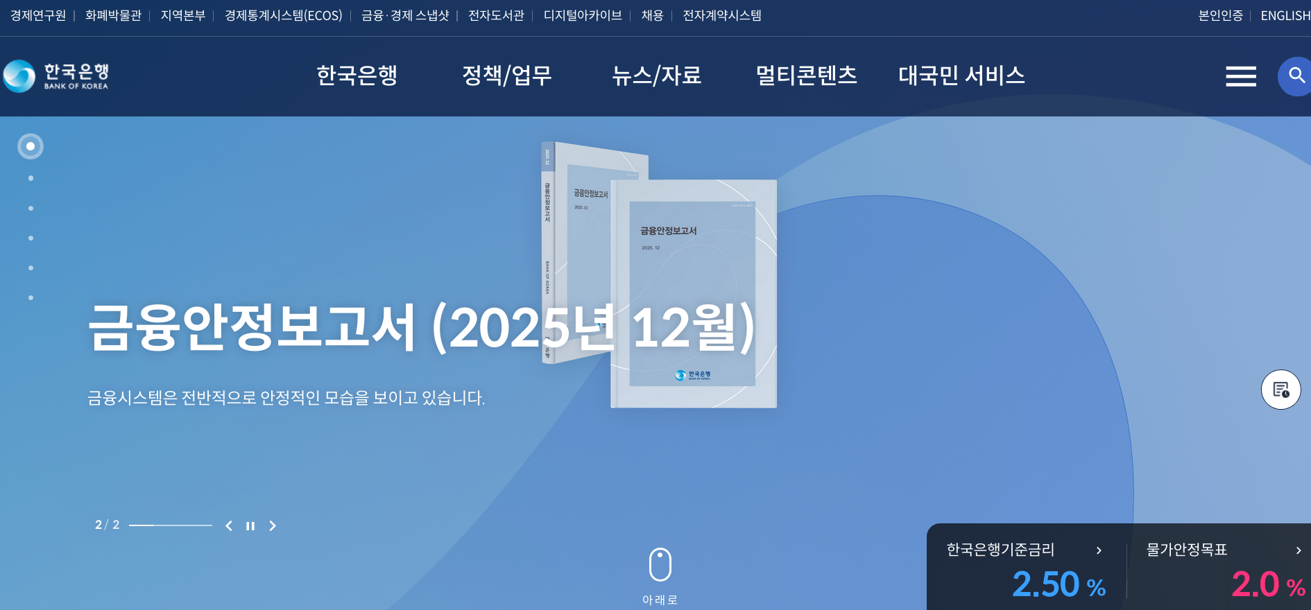 한국은행(韓國銀行, 영어: Bank of Korea, 약칭: 한은(韓銀), BOK)은 효율적인 통화신용정책의 수립과 집행을 통해 물가안정을 도모하여 국민 경제의 건전한 발전에 이바지하는 것을 목표로 하는 대한민국의 중앙은행이다. 대한민국의 통화인 대한민국 원의 발권은행이기도 하다. 1950년 6월 12일에 발족하였으며, 서울특별시 중구 남대문로3가에 있다. 2026-02-01