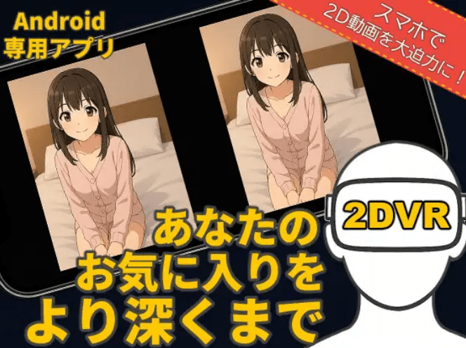 SBS(サイド・バイ・サイド)動画再生に対応したVRプレイヤーアプリ。 視界のすべてが「そのシーン」になる。 没入感バツグンのVRプレイヤーで、あなたの“お気に入り”をもっと深くまで。 プレイリスト機能や視線によるUI操作など、VR視聴をよりスムーズに実現。 スマホと市販のスマホ用VRゴーグルだけで、あなたの楽しみが何倍にも増すこと間違いなし! サークル名: !AmateurLab 販売日: 2025年07月03日 更新情報: 2025年09月27日 年齢指定: 全年齢 作品形式/ツール/アクセサリ ファイル形式: APK その他: AI一部利用 ジャンル: アニメ ファイル容量: 72.87MB この作品はスマートフォン専用作品です。 PCでは閲覧できませんのでご注意ください。 この作品はVR専用作品です。 楽しむには各種VR機器が必要となります。 注意事項▼ 本アプリはAndroid専用アプリです。(Androidバージョンは11以上必須) スマホのジャイロ機能を使用しているので、ジャイロ機能が弱いスマホの場合は視点操作が難しい可能性があります。(視点操作ではなく、画面タップでも操作できます。) かならず体験版で動作を確認した上でご購入ください。 また、本アプリには動画データは含まれておりませんのでご自身でご用意ください。 このアプリは動画視聴を個人で楽しむためのものであり、アプリによる出力結果を他者へ配布することを禁止します。 ☆アップデート予定☆ アップデートによる機能追加を考えており、価格も上昇させる予定です。(アップデート自体は無料) 最新バージョン更新のアナウンスがアプリ内に表示されるのでDLsiteにて再DLをお願いいたします。 アプリ機能リスト ・ 動画のお気に入りフィルタリング機能 ・ プレイリスト作成機能 ・ 動画再生時の頭振り・視点操作によるハンズフリー機能 ・ シャッフル再生、ループ再生機能 ・ 【動画ごとに個別設定】特定再生位置に瞬時に移動できる機能(アップデート予定) ・ 【動画ごとに個別設定】特定の区間をリピート再生できる機能(アップデート予定) ・ 【動画ごとに個別設定】指定ポイントから逆算してカウントダウンを表示する機能(実装済み)Spider