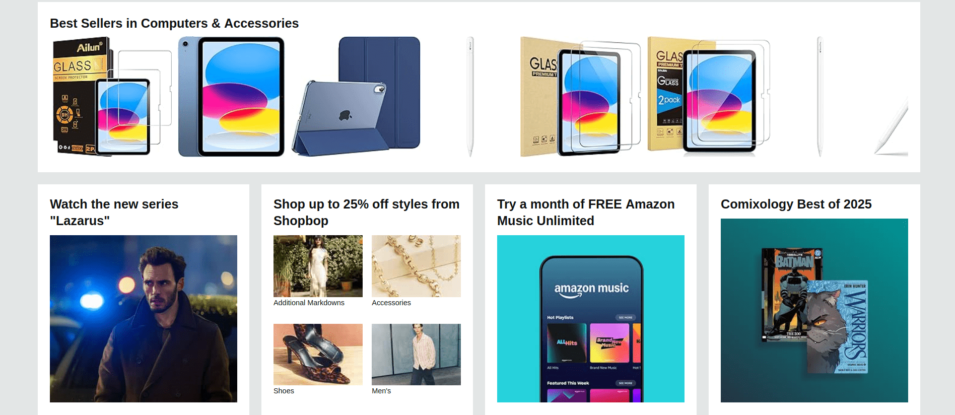 Free shipping on millions of items. Get the best of Shopping and Entertainment with Prime. Enjoy low prices and great deals on the largest selection of everyday essentials and other products, including fashion, home, beauty, electronics, Alexa Devices, sporting goods, toys, automotive, pets, baby, books, video games, musical instruments, office supplies, and more.