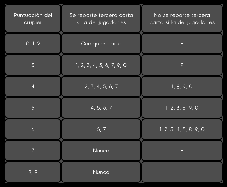Si ninguna mano tiene un 8 o 9, se aplican reglas específicas para determinar si se reparte una tercera carta. (Explicado en la siguiente sección).