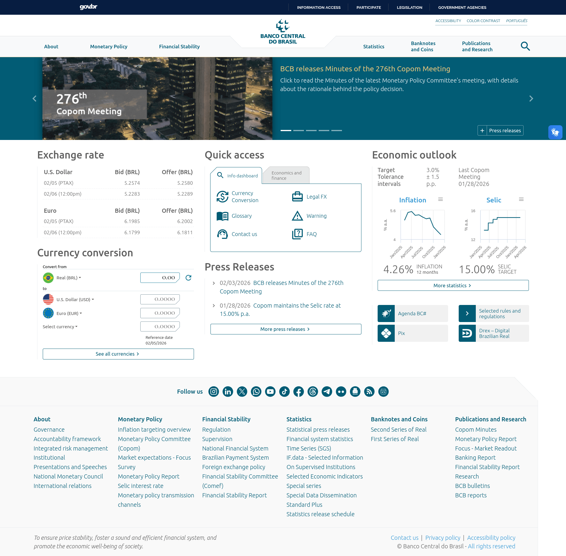 O Banco Central do Brasil (também conhecido pelas siglas BC e BCB ou pelo acrônimo BACEN) é uma autarquia federal autônoma integrante do Sistema Financeiro Nacional sem vinculação a nenhum Ministério. 2026-02-06