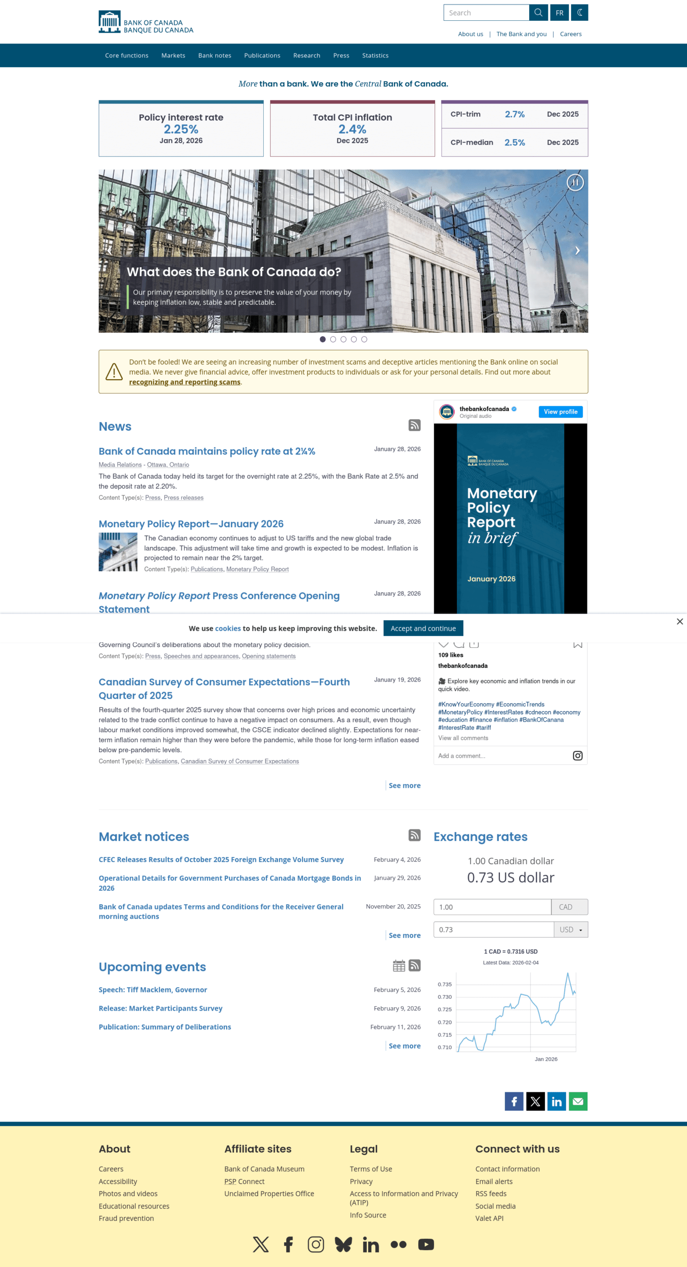 The Bank of Canada (BoC; French: Banque du Canada) is a Crown corporation and Canada’s central bank. Chartered in 1934 under the Bank of Canada Act, it is responsible for formulating Canada’s monetary policy, and for the promotion of a safe and sound financial system within Canada. The Bank of Canada is the sole issuing authority of Canadian banknotes, provides banking services and money management for the government, and loans money to Canadian financial institutions. The contract to produce the banknotes has been held by the Canadian Bank Note Company since 1935.