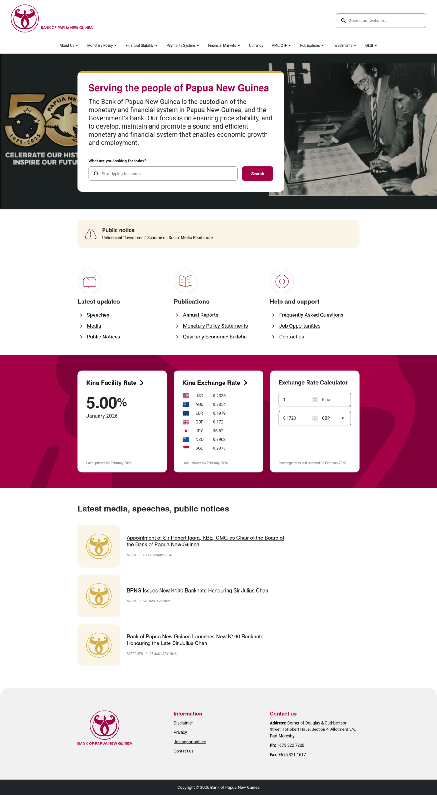 The Bank of Papua New Guinea (Tok Pisin: Beng bilong Papua Niugini) is the central bank of Papua New Guinea, which has a core mandate to ensure price stability and maintain macroeconomic growth. To achieve this, it discharges four main functions; 1. responsible for the formulation and implementation of monetary policy, 2. ensure financial system development and stability, 3. ensure the payment system remain efficient, and 4. provide a banking role to the Government. It also manages the country’s foreign reserves, issue the country’s currency, manages the gold and foreign exchange of Papua New Guinea.