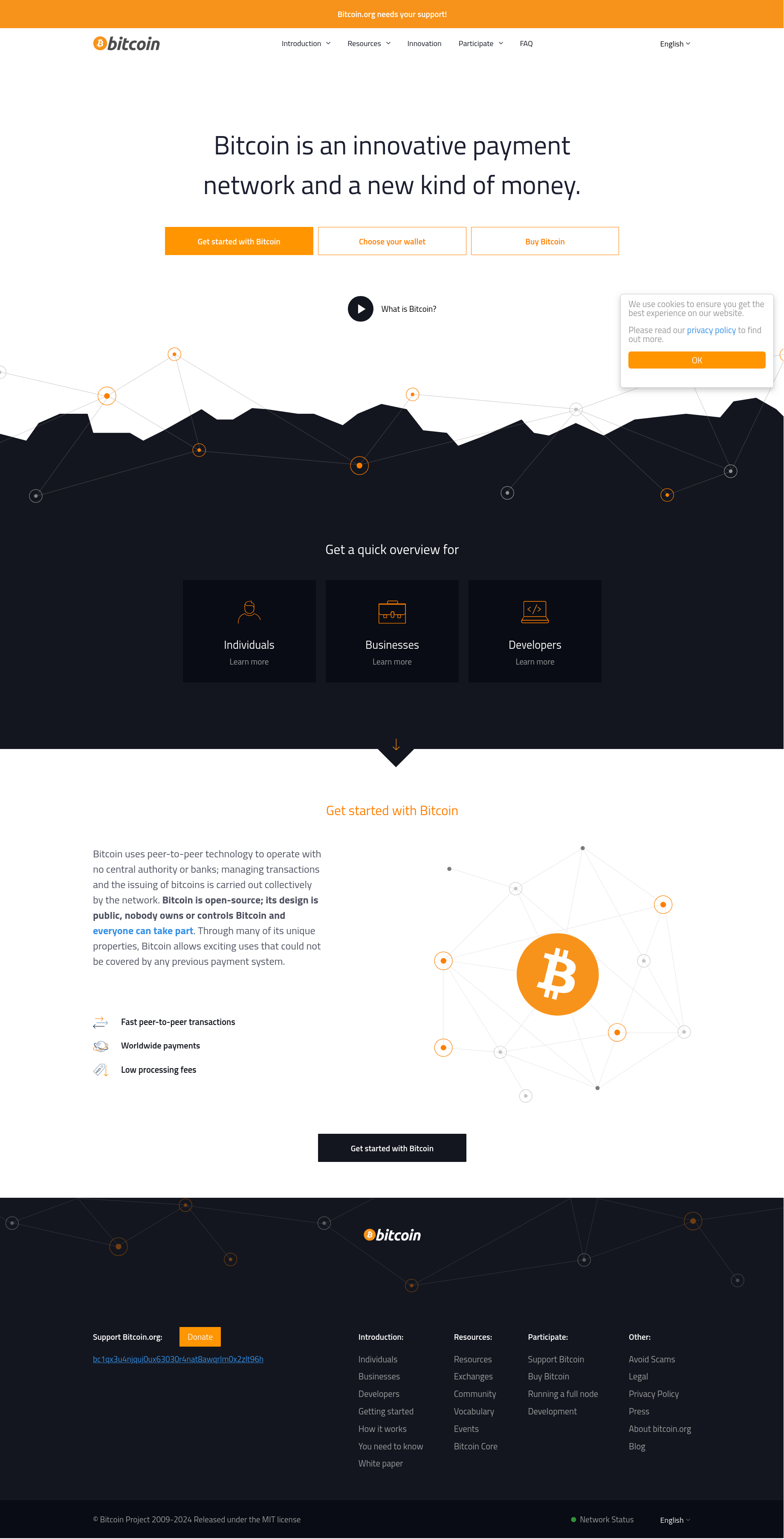 Nodes in the peer-to-peer bitcoin network verify transactions through cryptography and record them in a public distributed ledger, called a blockchain, without central oversight. Consensus between nodes is achieved using a computationally intensive process based on proof of work, called mining, that secures the bitcoin blockchain. Mining consumes large quantities of electricity and has been criticized for its environmental impact.
