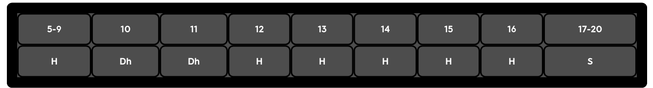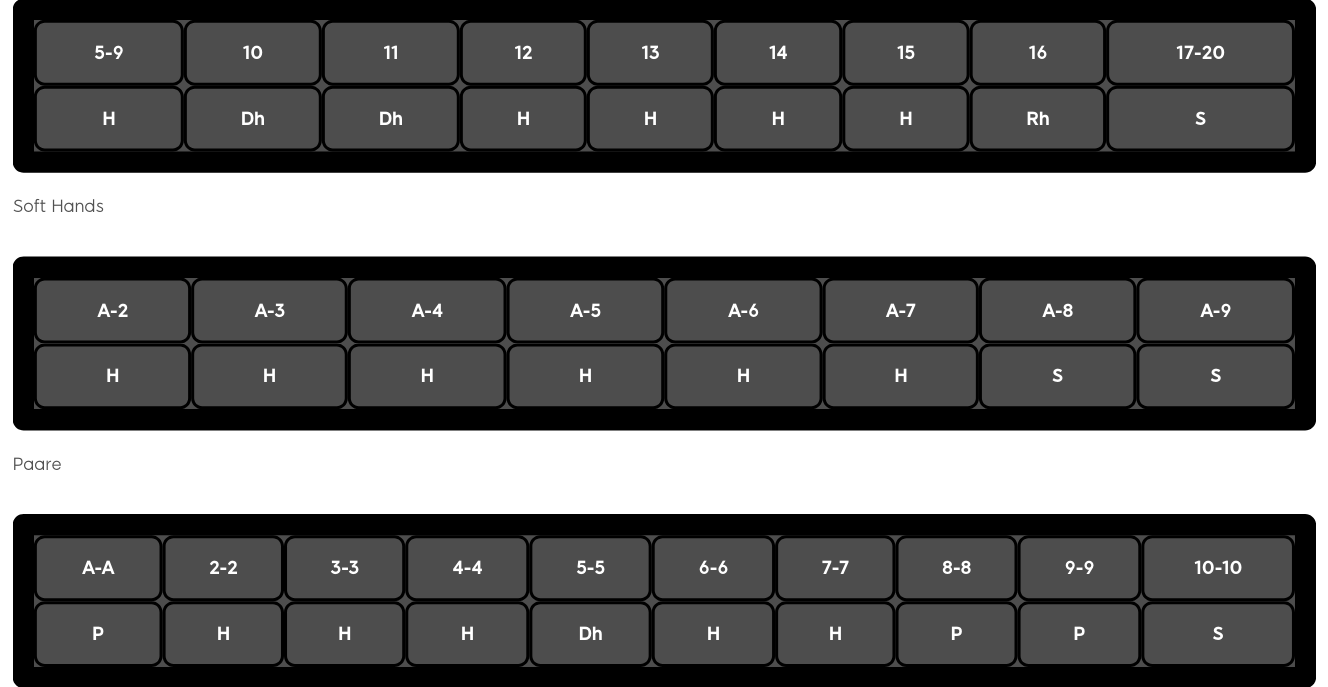 Nachfolgend finden Sie die entsprechende Spielstrategie in drei farbcodierten Tabellen für Hard Hands, Soft Hands und Paare. Die erste Zeile in jeder Tabelle stellt die Hand des Spielers dar (im Fall von Hard Hands die Gesamtzahl der Karten), und die zweite Zeile enthält die korrekte Spielstrategie gegen eine 9 als Upcard des Dealers, unabhängig von dem jeweiligen Mix aus Regeln.