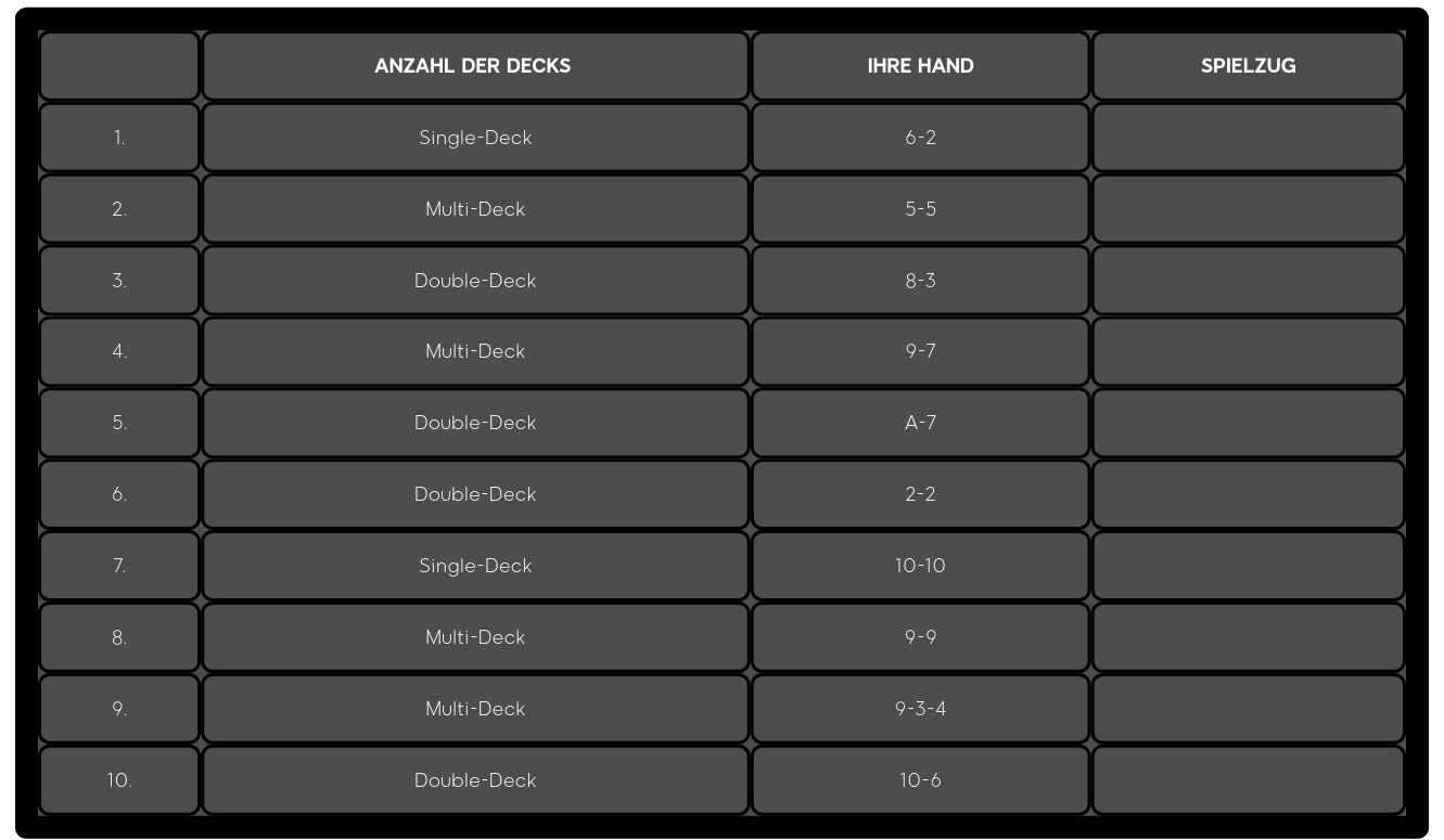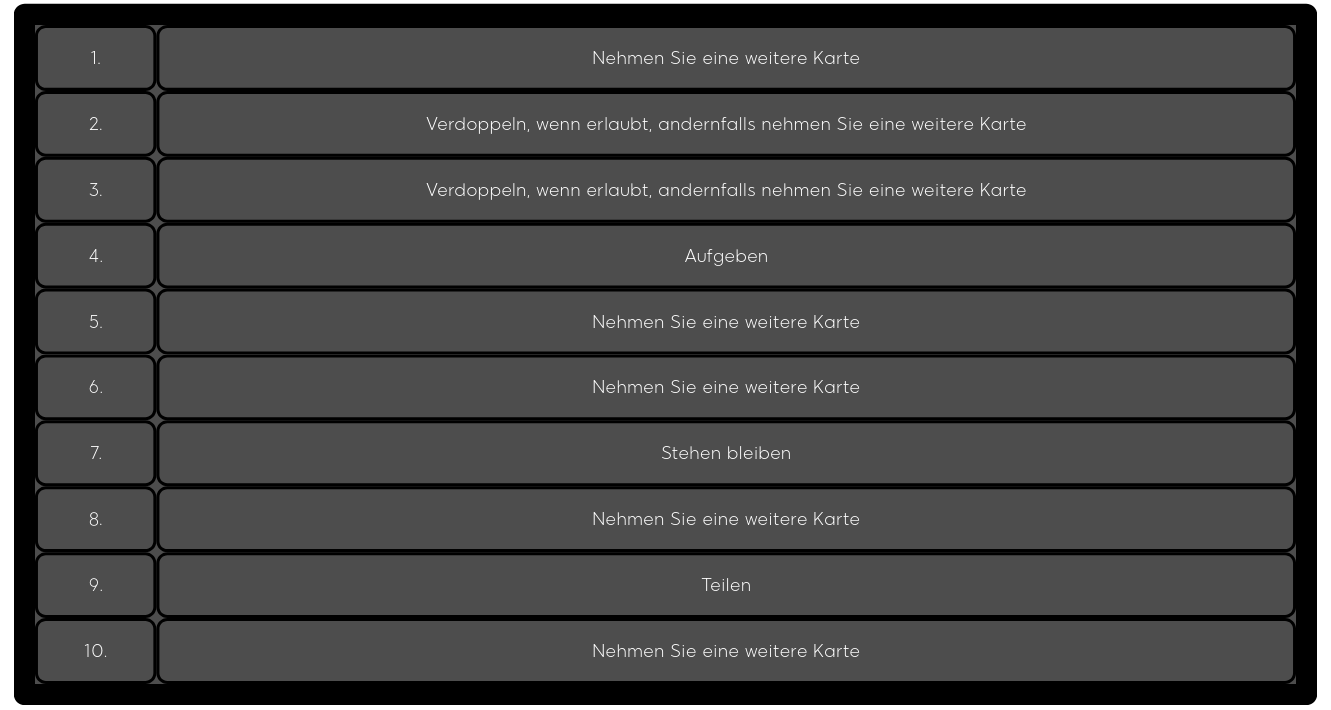 Die korrekten Spielzüge für die Hände in der Tabelle sind:
