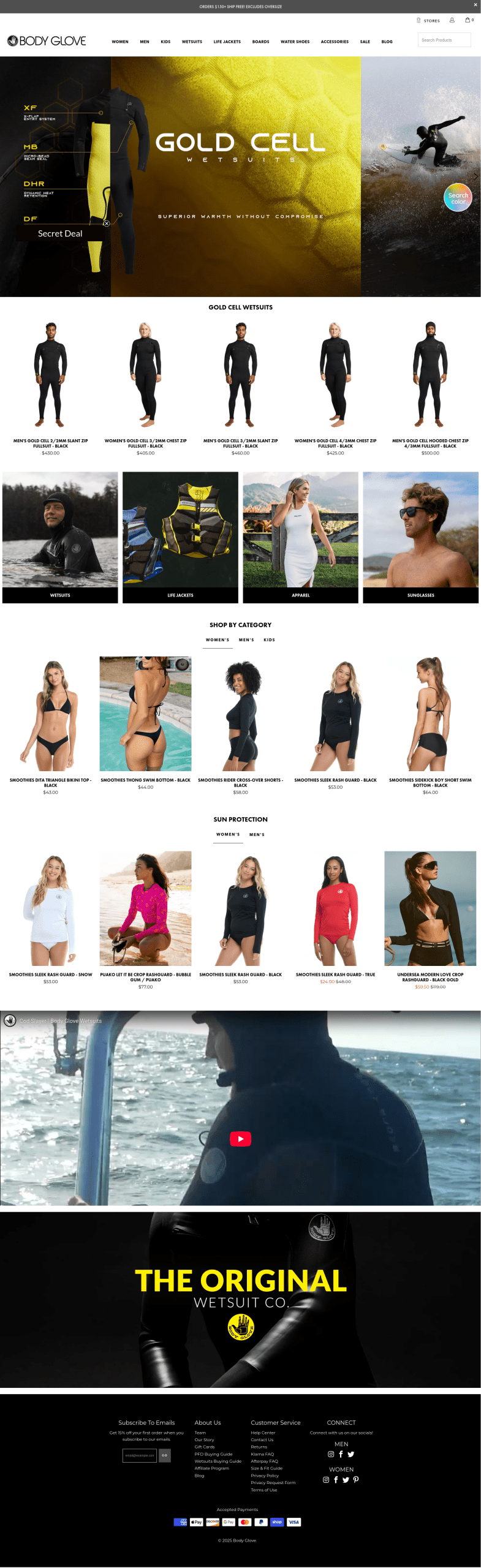Body Glove International, LLC. is an American brand of watersports apparel and accessories that was founded in 1953 by twin brothers Bill and Bob Meistrell. The brothers are often credited with inventing the first practical wetsuit in the early 1950s at the back of their Redondo Beach, California, surf shop, Dive N’ Surf. From those wetsuits, Body Glove branched out into other product categories. They now make wetsuits, swimsuits, clothing, shoes, life vests, sunglasses, wakeboards, paddle boards, towables, backpacks, phone cases and snorkeling equipment.