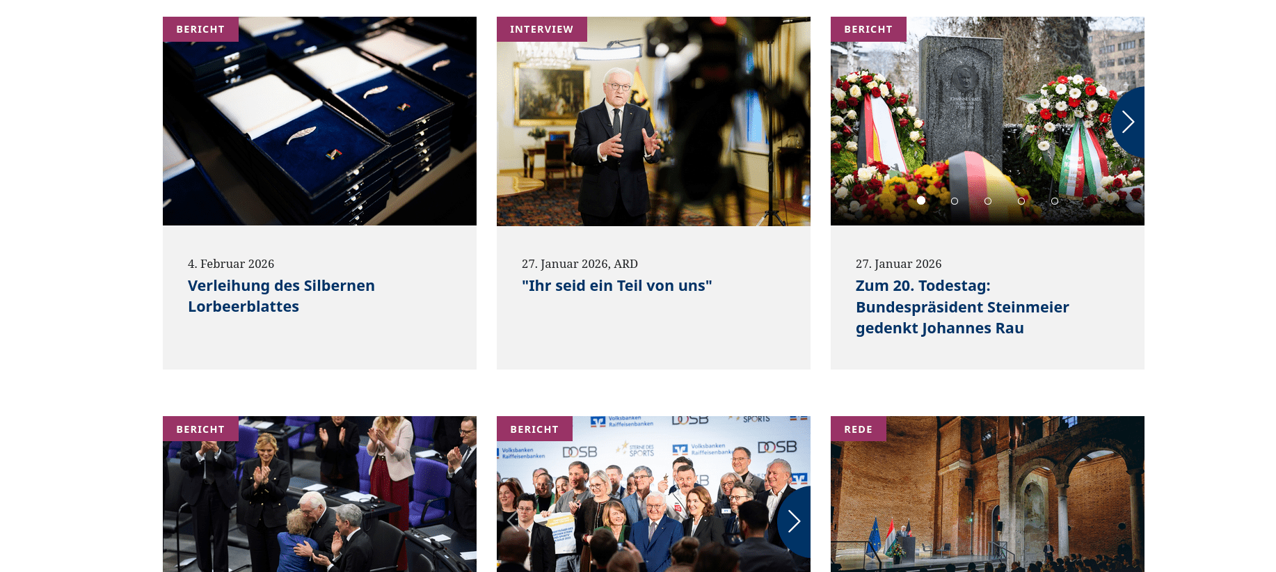Der Bundespräsident (Abkürzung BPr, auch BPräs) ist das Staatsoberhaupt (Art. 54–61 GG) der Bundesrepublik Deutschland und protokollarisch ihr höchstes Verfassungsorgan. 2026-01-28