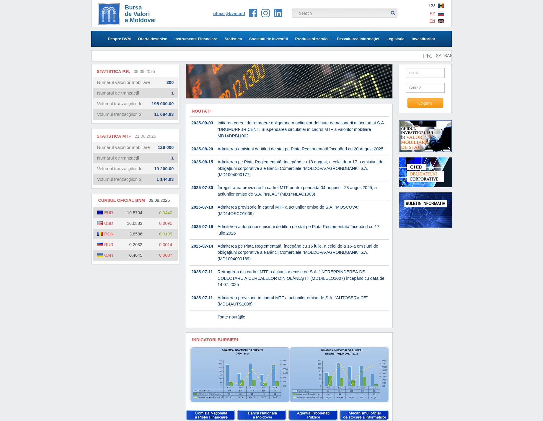 The Moldova Stock Exchange (Romanian: Bursa de Valori a Moldovei) is the only stock exchange in Moldova. Founded in 1994, the exchange now has 17 financial service providers that act as members and participants. Over 30 companies are listed on the regulated market, while more than 500 companies are listed on the low-cap marketplace operated by the exchange.