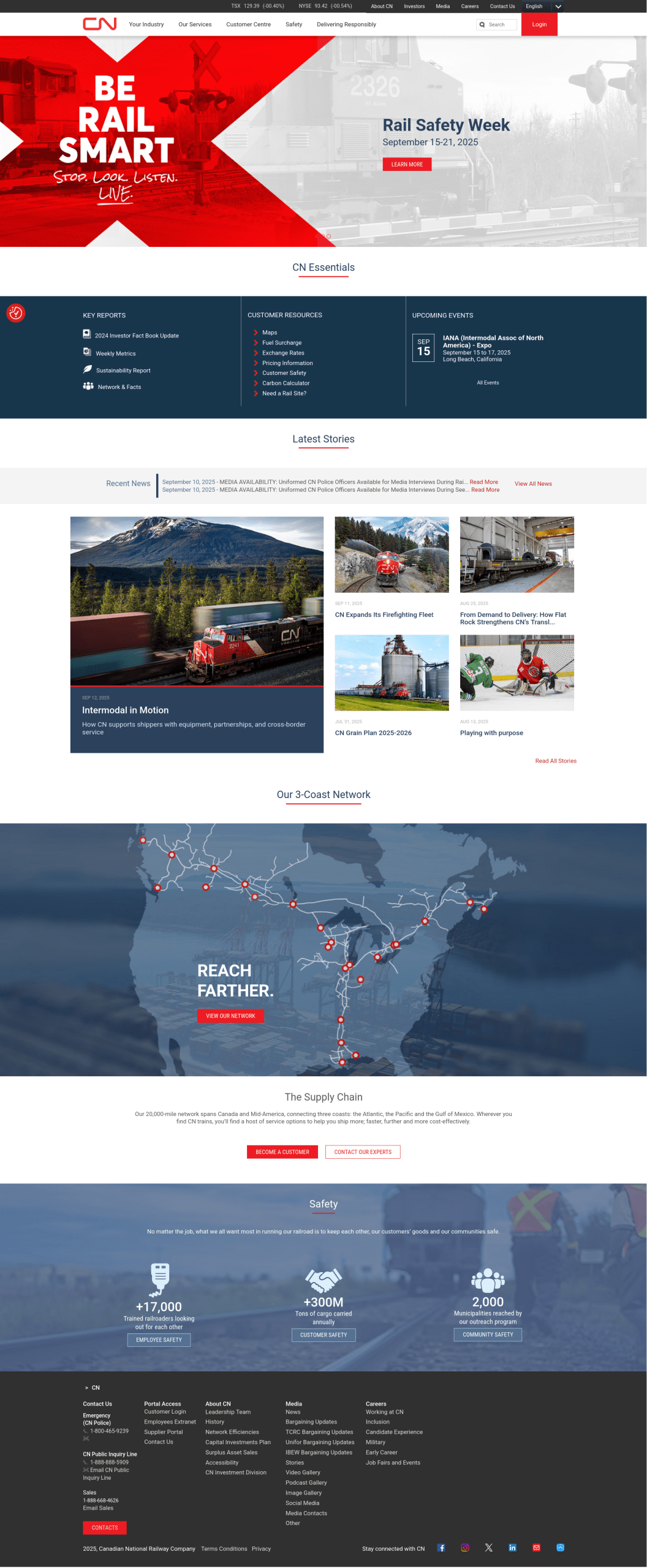 The Canadian National Railway Company (French: Compagnie des chemins de fer nationaux du Canada) (reporting mark CN) is a Canadian Class I freight railway headquartered in Montreal, Quebec, which serves Canada and the Midwestern and Southern United States. It is one of Canada’s two main freight rail companies, along with Canadian Pacific Kansas City.