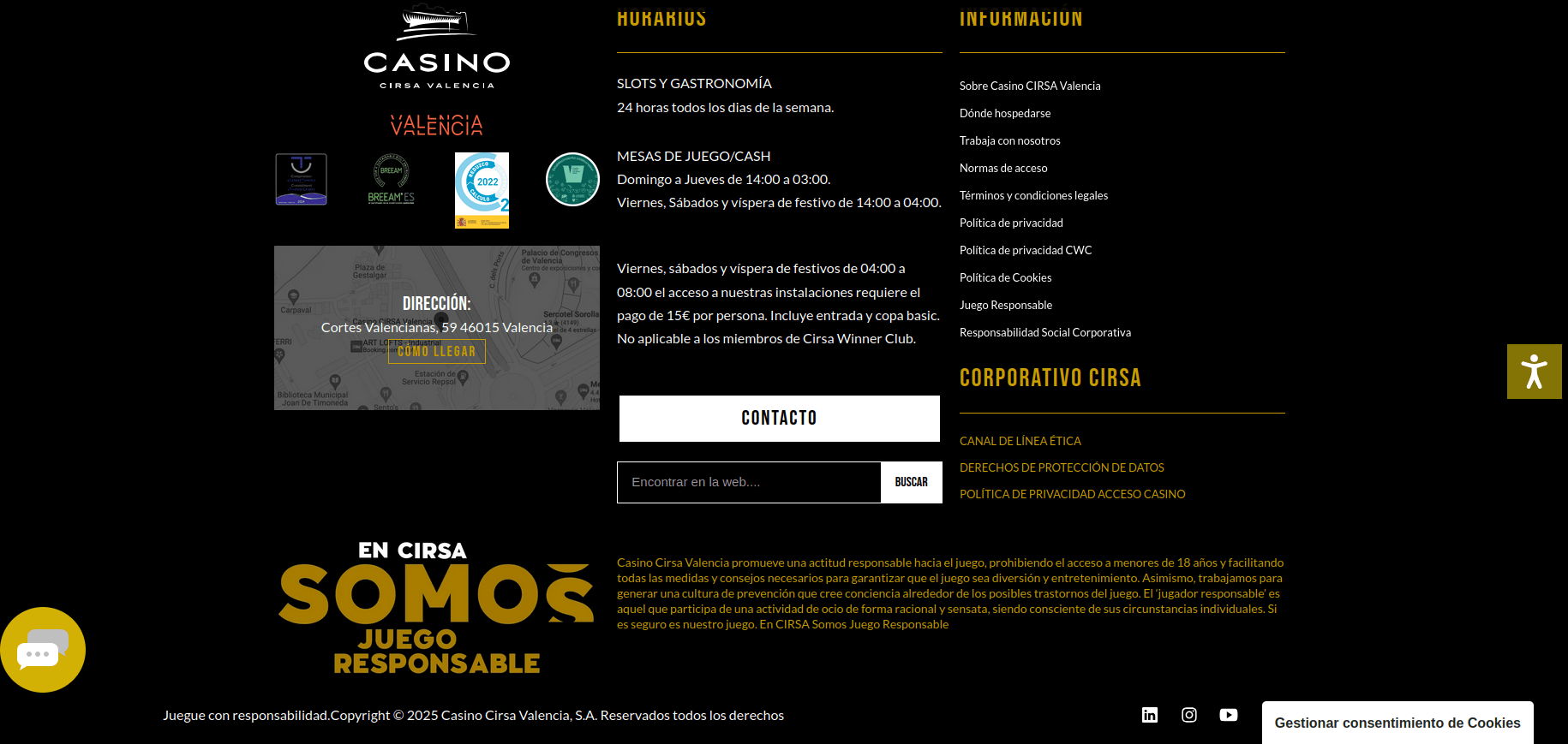 Casino Cirsa Valencia promueve una actitud responsable hacia el juego, prohibiendo el acceso a menores de 18 años y facilitando todas las medidas y consejos necesarios para garantizar que el juego sea diversión y entretenimiento. Asimismo, trabajamos para generar una cultura de prevención que cree conciencia alrededor de los posibles trastornos del juego. El ‘jugador responsable’ es aquel que participa de una actividad de ocio de forma racional y sensata, siendo consciente de sus circunstancias individuales. Si es seguro es nuestro juego. En CIRSA Somos Juego Responsable.
