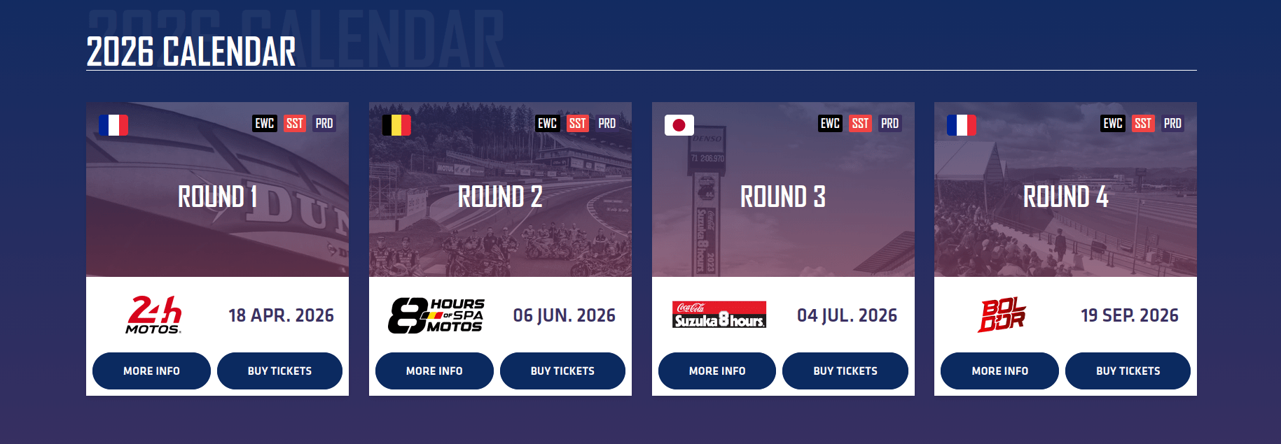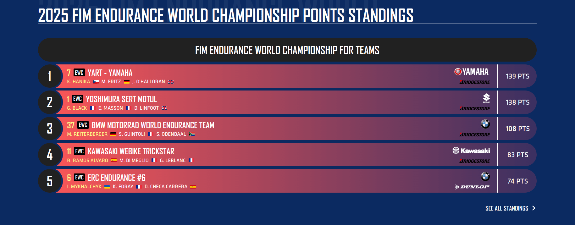 The Endurance World Championship (FIM EWC) is the premier worldwide endurance championship in motorcycle road racing. The championship season consists of a series of endurance races (with a duration of six, eight, twelve or twenty-four hours) held on permanent racing facilities. The results of each race are combined to determine three World Championships – riders, teams and manufacturers.