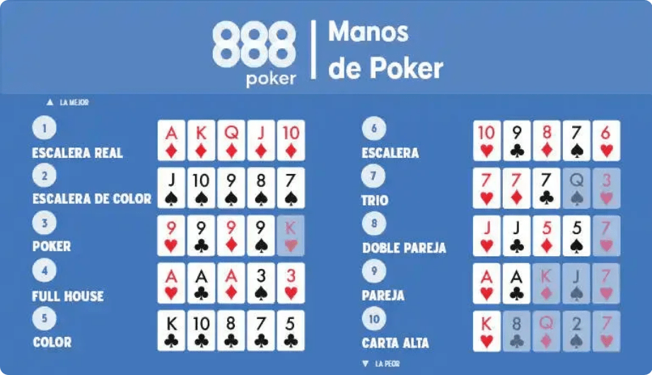 ・ Carta Alta o High Card: la mano más baja posible, utilizada cuando no formas ninguna otra mano.