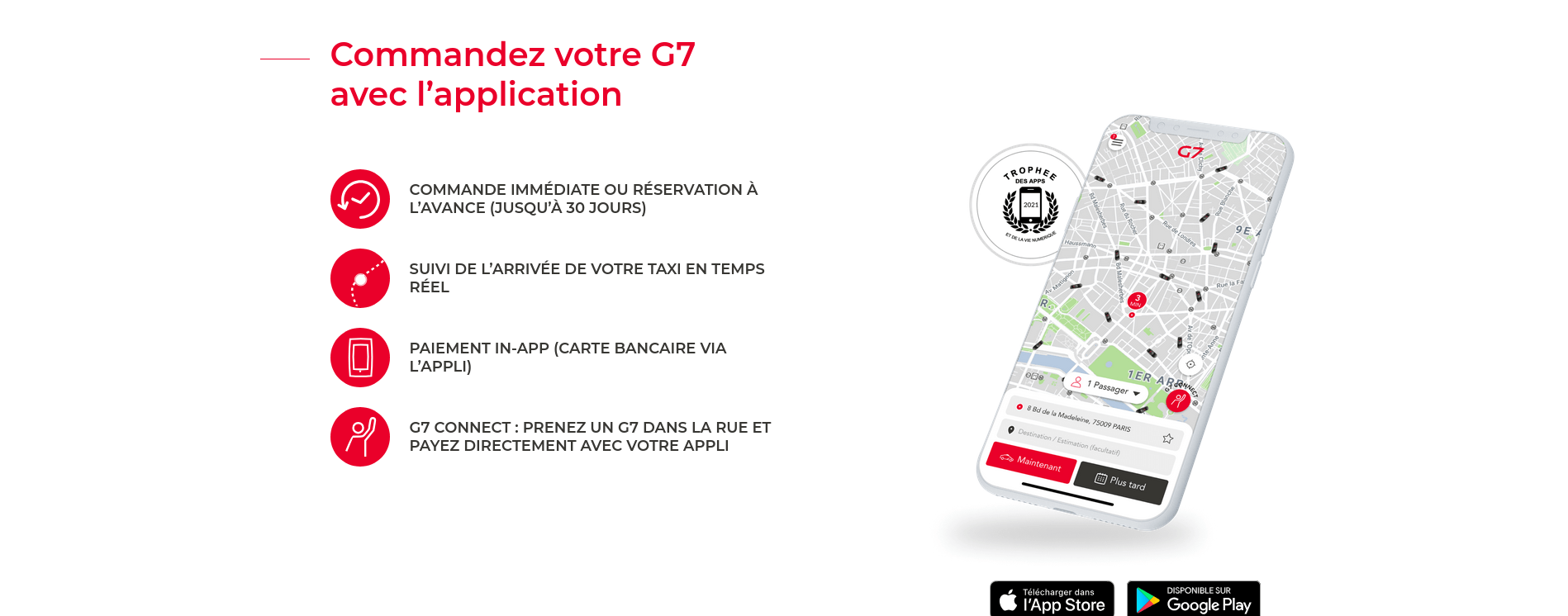 With an average rating of 4.9/5, G7 drivers are carefully selected, as our passengers’ safety is of paramount importance: criminal records check, maximum working time of 11 hours, no access to your phone number. Using designated bus and taxi lanes makes your journey times shorter, at no extra cost.