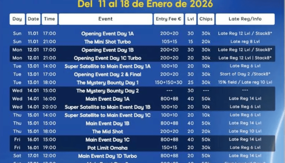 Para 888poker.Es, además de una excelente forma de presentar la nueva temporada de poker en vivo al funcionar como primer gran festival del año, esta cita es además un termómetro inicial del ecosistema de póker en vivo nacional, marcando el tono de lo que vendrá en los meses siguientes, que en el calendario de poker en vivo 2026 va a contar con el 888poker Live Barcelona en el mes de mayo y con cuatro etapas del nuevo circuito nacional de 888 Holdings: Noche de Poker El Festival, con sus etapas confirmadas en Gran Vía Madrid, Alicante, Sevilla y Murcia.