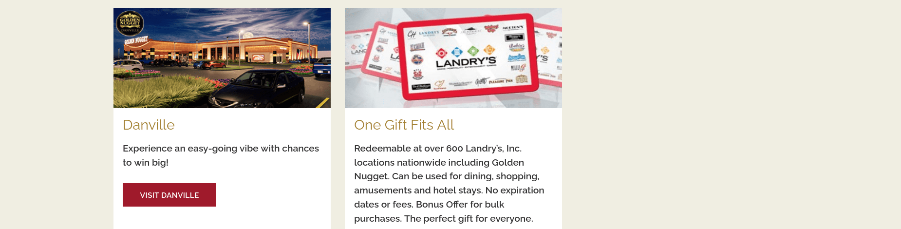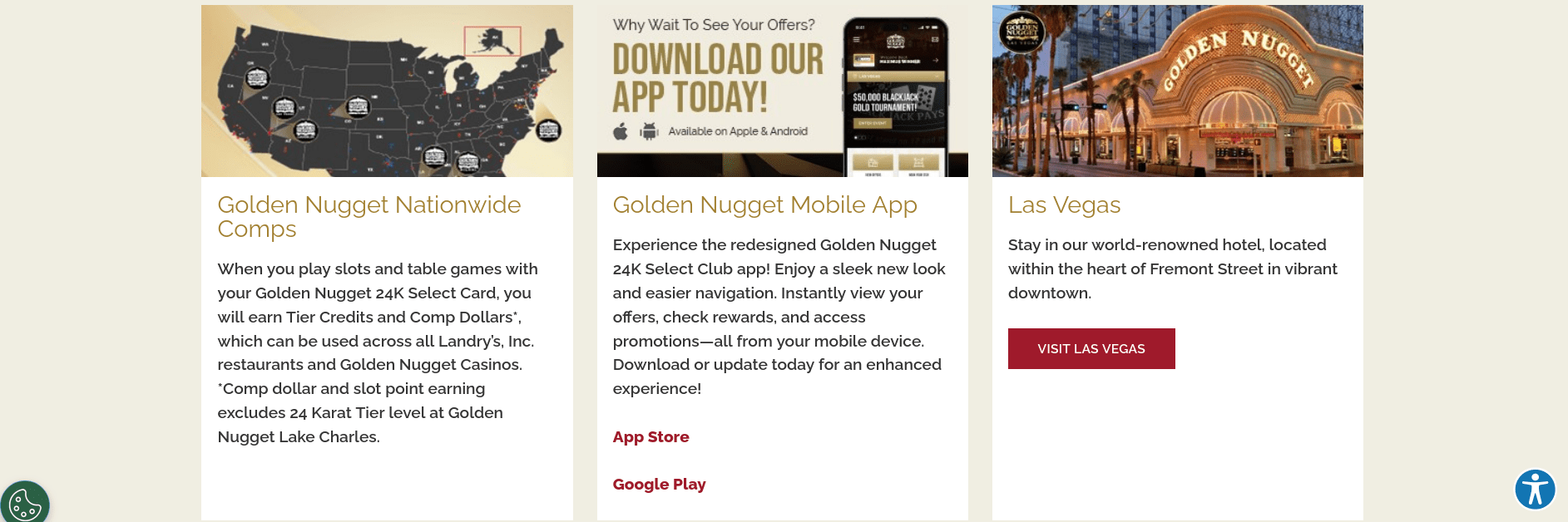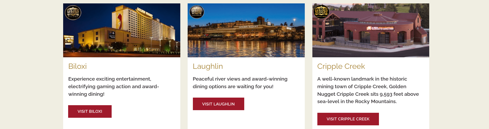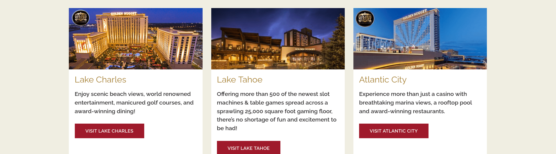 Golden Nugget Hotels & Casinos is an American chain of luxury hotels and casinos. It currently operates six casino resorts in Nevada, Louisiana, New Jersey, Illinois, and Mississippi. The original location was the Golden Nugget Las Vegas which opened in 1946. The company runs as a division of Landry’s Hospitality within the Fertitta Entertainment portfolio.