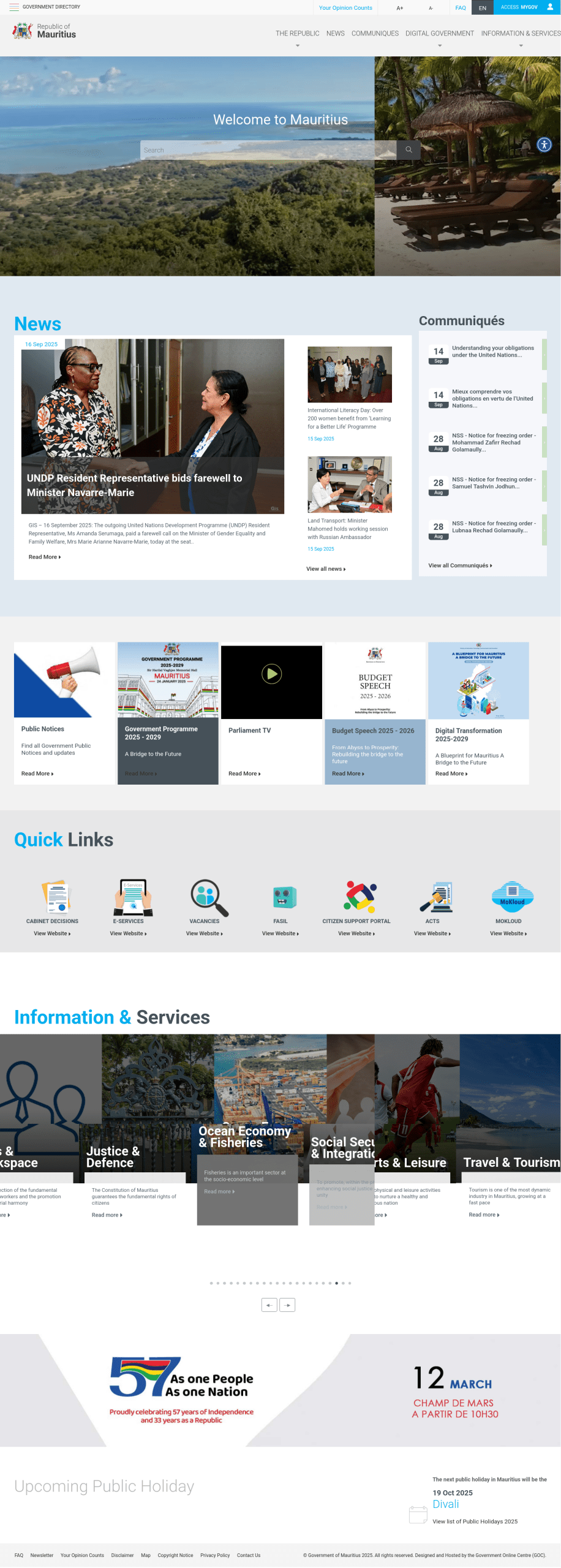 The Government of Mauritius (French: Gouvernement de Maurice) is the main authority of the executive power in the Republic of Mauritius. The head of the Government is the Prime Minister of Mauritius, who manages the main agenda of the Government and direct the ministers.