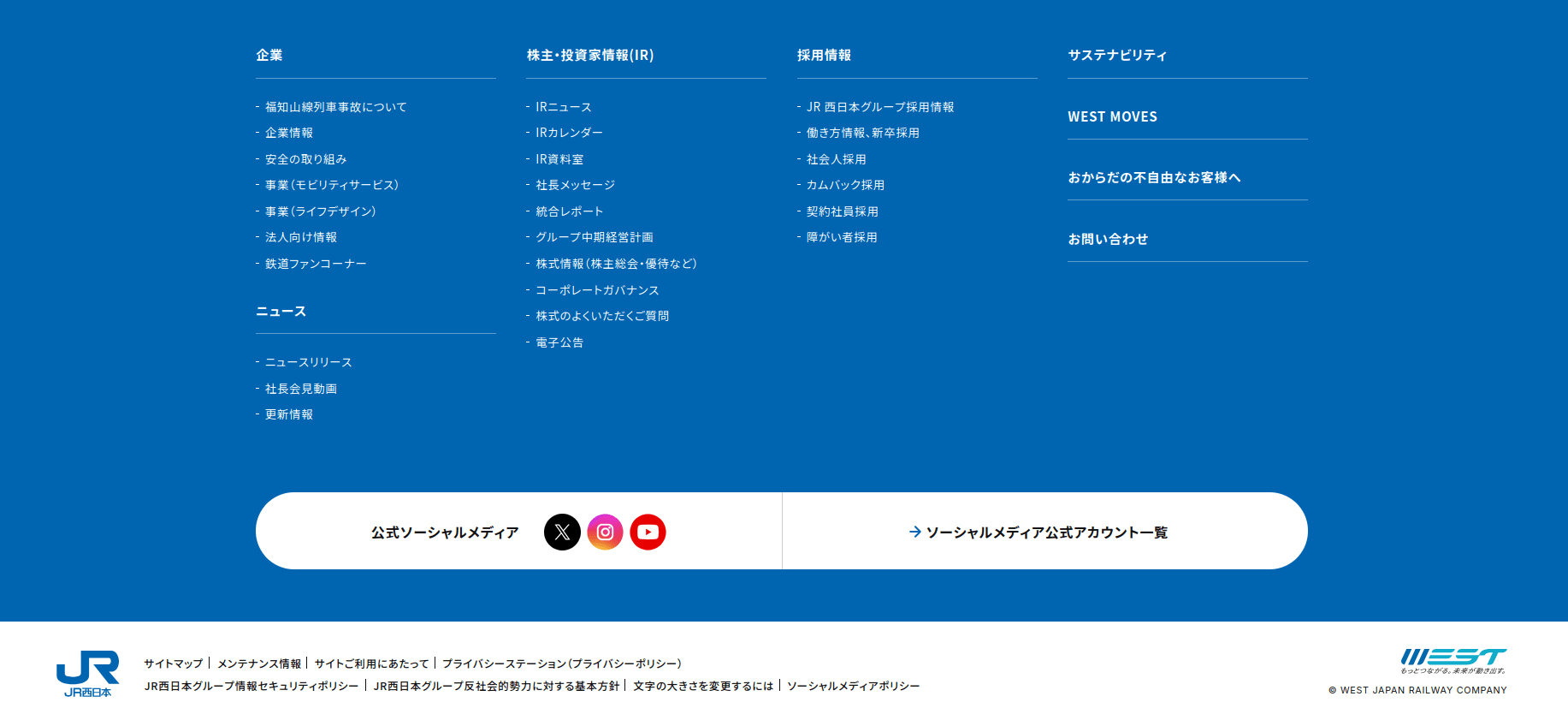 西日本旅客鉄道株式会社(にしにほんりょかくてつどう、英: West Japan Railway Company)は西日本を中心として旅客鉄道等を運営する日本の鉄道事業者。JRグループの旅客鉄道会社の一つ。通称はJR西日本(ジェイアールにしにほん)、英語略称はJR WEST。コーポレートカラーは青色。本社は大阪府大阪市北区。東京証券取引所プライム市場の上場企業。日経平均株価およびTOPIX Large70の構成銘柄の一つ。 2024-08-19