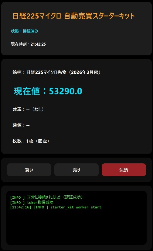 このスターターキットは、KabuステーションAPIを利用した日経225先物(マイクロ・ミニ・ラージ)の本格的な自動売買システムを実装していくための最初のベースとなります。