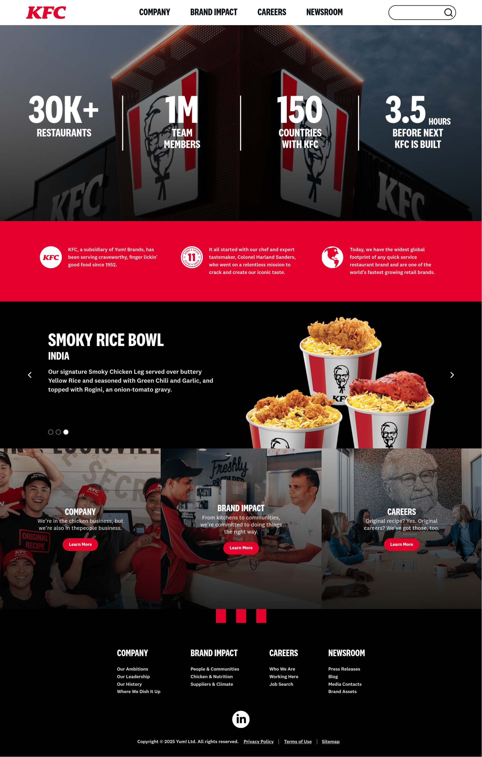 KFC Corporation, doing business as KFC (an abbreviation of Kentucky Fried Chicken), is an American fast food restaurant chain specializing in Southern fried chicken and chicken sandwiches. Headquartered in Louisville, Kentucky, it is the world’s second-largest restaurant chain (as measured by sales) after McDonald’s, with over 31,980 locations globally in 150 countries, as of September 2025 The chain is a subsidiary of Yum! Brands, a restaurant company that also owns the Pizza Hut and Taco Bell chains.