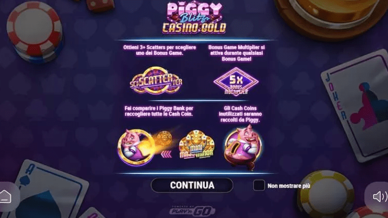 Insomma, tra i giochi da casino Piggy Blitz Casino Gold di Play’n’Go è una slot che combina la semplicità di una slot classica con dinamiche innovative, come la raccolta delle monete che porta a un bonus casuale, oppure la possibilità di scegliere due funzioni bonus diverse al momento dello sblocco del bonus game.