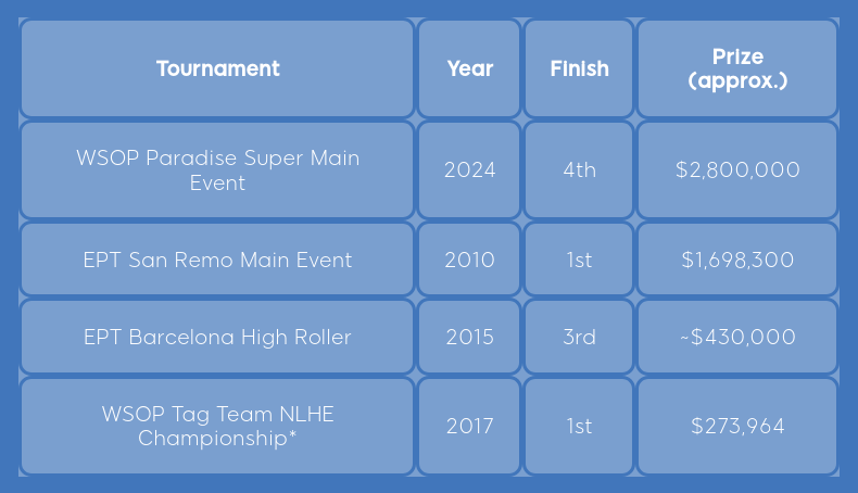 Boeree’s publicly recorded live tournament earnings are about $6.7 million across 107 cashes. About $2.8 million, over 40% of the total, comes from a single result: the 2024 WSOP Paradise Super Main Event.