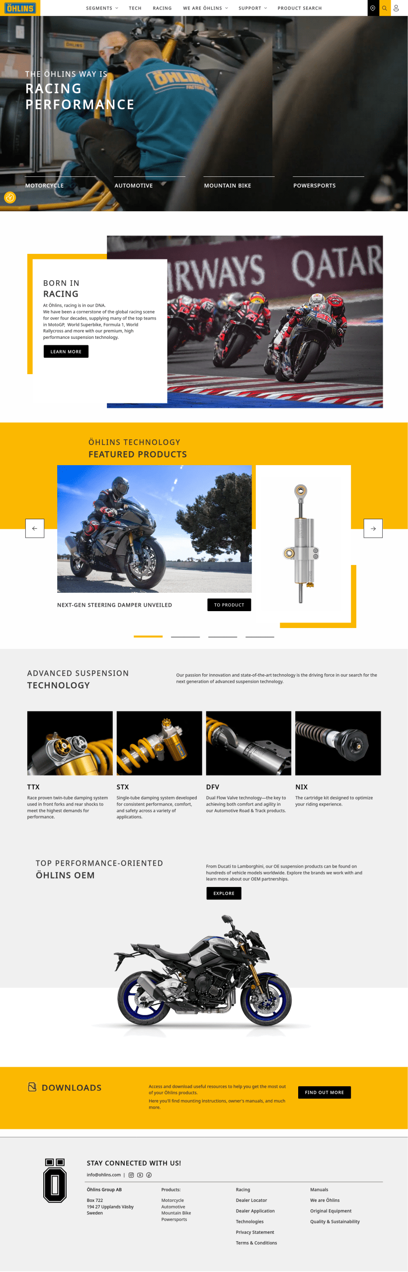 Öhlins Racing AB (commonly Öhlins) is a Swedish company that develops suspension systems for the automotive, motorcycle, mountain bike and motorsport industries. Approximately 97% of all production is exported and Öhlins has distribution in over 50 countries worldwide. The company also produces other types of vehicle components, including steering dampers and ride height control systems. A two-wheel drive system for motorcycles has been produced in the past.