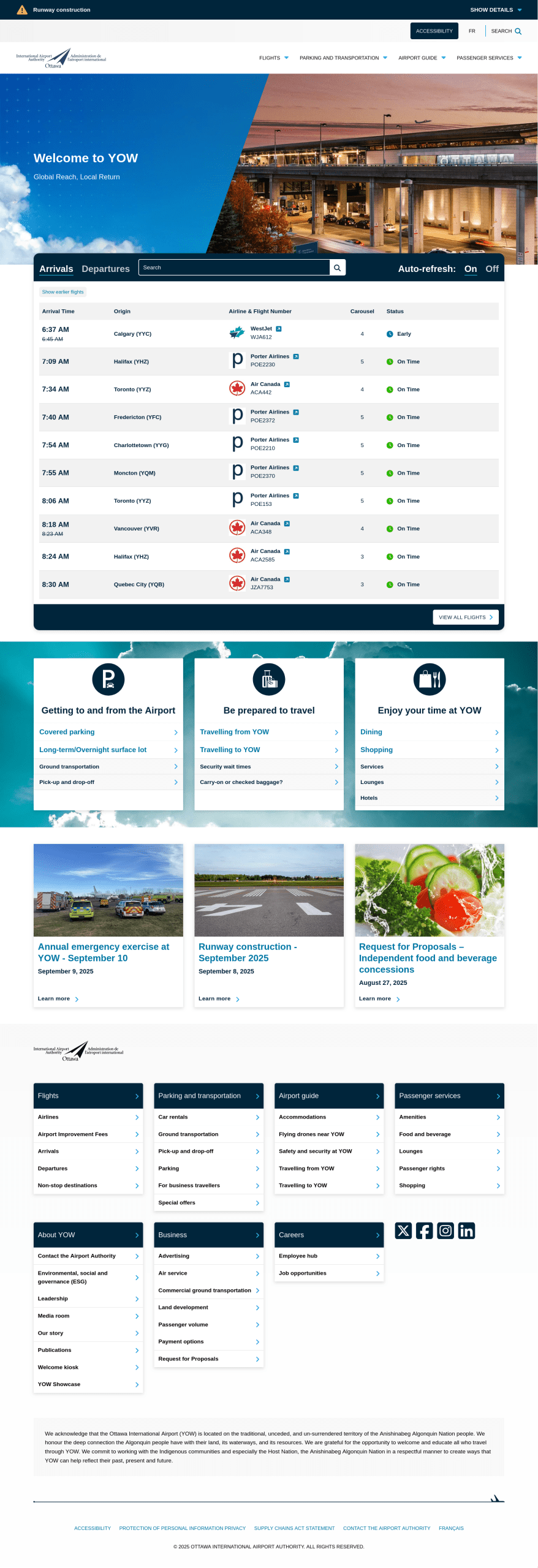 Ottawa/Macdonald–Cartier International Airport (IATA: YOW, ICAO: CYOW) or simply Ottawa International Airport is the main international airport serving Ottawa, Ontario, Canada, and its metropolitan area as well as Gatineau, Quebec known as the National Capital Region. It is named after the Canadian statesmen and two of the “founding fathers of Canada”, Sir John A. Macdonald and Sir George-Étienne Cartier. Located 8 nautical miles (15 km; 9.2 mi) south of downtown Ottawa in the south end of the city, it is Canada’s sixth-busiest airport, Ontario’s second-busiest airport by airline passenger traffic, with 4,606,824 passengers in 2024. The airport is a hub for Porter Airlines, a focus city for Air Canada and a home base for Canadian North (formerly First Air).
