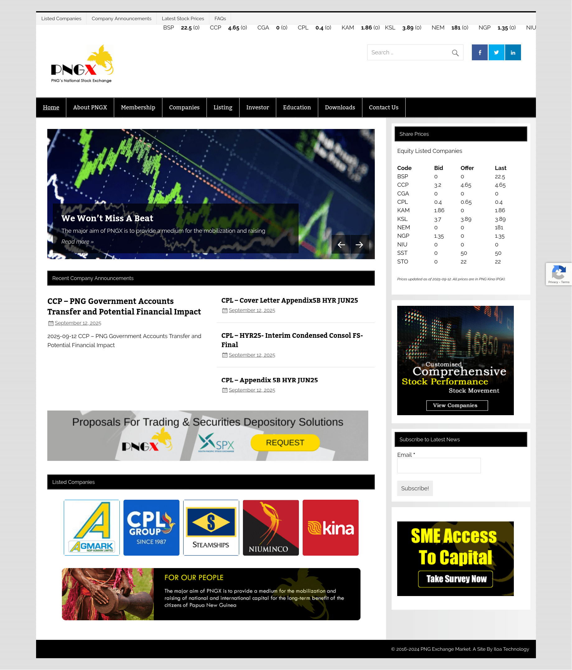 Share Prices, Equity, Listed Companies, Prices updated as of . All prices are in PNG Kina (PGK). 2025-09-16