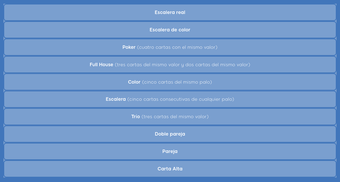 Las combinaciones de cartas de poker de mayor a menor valor son: