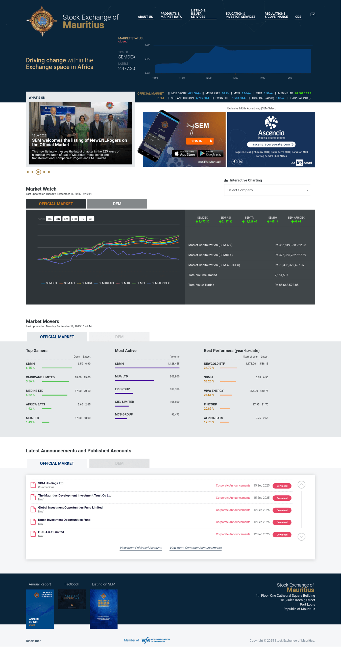 The Stock Exchange of Mauritius (SEM) (French: Bourse de Maurice); is an organization responsible for the operation of Mauritius’s primary stock exchange located at Port Louis. The SEM operates two markets: the Official Market and the Development & Enterprise Market (DEM). There are 40 companies listed on the Official Market representing a Market Capitalization of nearly US$5.3 billion, the DEM presently has 48 companies listed with a market capitalisation of nearly US$1.5 billion as at 31 July 2012. SEM is one of the leading Exchanges in Africa and a member of the World Federation of Exchanges.