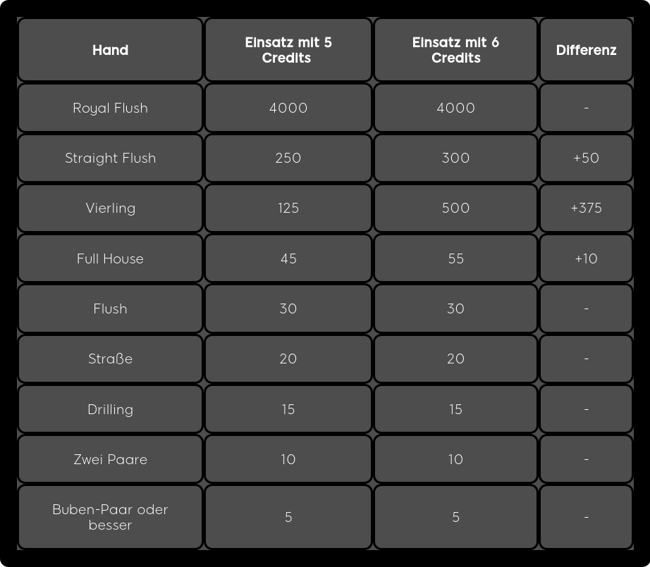 Für die Standardversion von Jacks or Better finden Sie nachfolgenden die Auszahlungen für die jeweiligen Gewinnhände bei einem Maximaleinsatz von fünf Credits pro Hand: