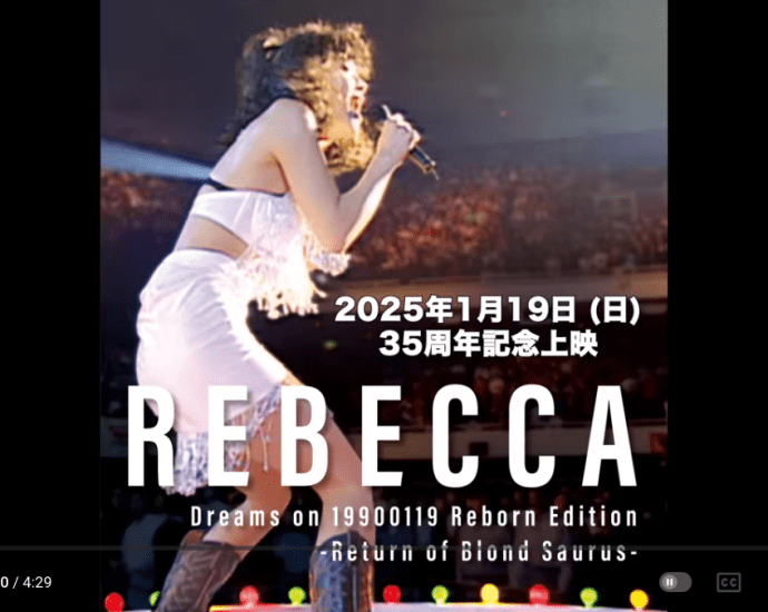 ●REBECCAライヴ・フィルム『Dreams on 19900119 Reborn Edition-Return of Blond Saurus-』 (劇場版5.1chリマスター) 35周年記念日上映【2024年/日本/DCP/16:9/2ch/115分】 ・日時:2025年1月19日(日)  ・開映:17:30(予定) ・チケット:前売り3,000円(税込)、当日4,000円(税込) ※109シネマズプレミアム新宿のみ、以下の料金が別途必要となります  CLASS A 上記料金プラス2,600円(税込/全席指定)  CLASS S 上記料金プラス4,600円(税込/全席指定) ※上記チケット料金にはウェルカムコンセッション含むその他サービス料金が含まれています。 ●完全生産限定盤アナログ タイトル:NOSTALGIC NEW WORLD 発売日:2024年12月11日(水) 品番:MHJL-375 仕様・価格:LP1枚33RPM・6,600円(税込) ※オリジナルターンテーブルマット付 ●UHD-Blu-ray他、Blu-ray Disc、DVDの3形態で発売中! 「Dreams on 19900119 Reborn Edition-Return of Blond Saurus-」 ・ご予約はこちら:https://lgp.lnk.to/20240710_REBECCA_PKG ●7年振りの新作、発売中! タイトル:NOSTALGIC NEW WORLD 品番:MHCL31027~8 仕様・価格:BSCD2仕様、2枚組・4,950円(込) ●REBECCA特設サイト:https://110107.com/rebecca_90movie ●NOKKO Official ・Official HP:Spider