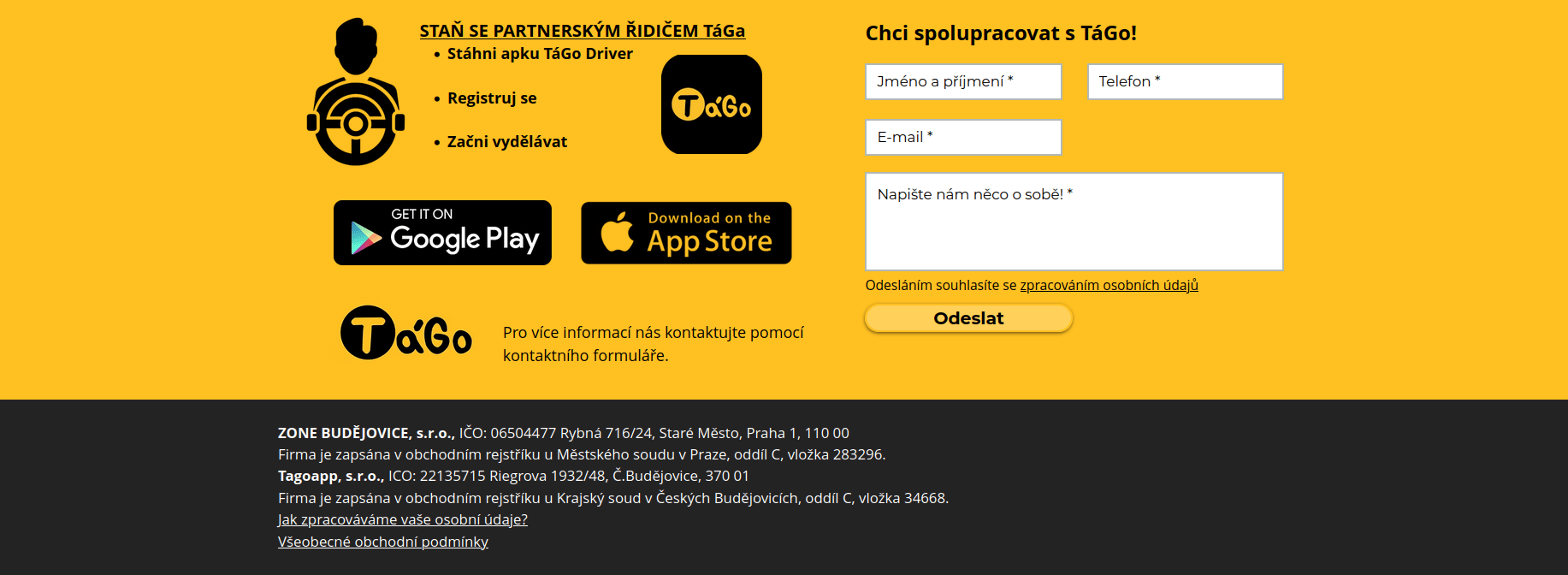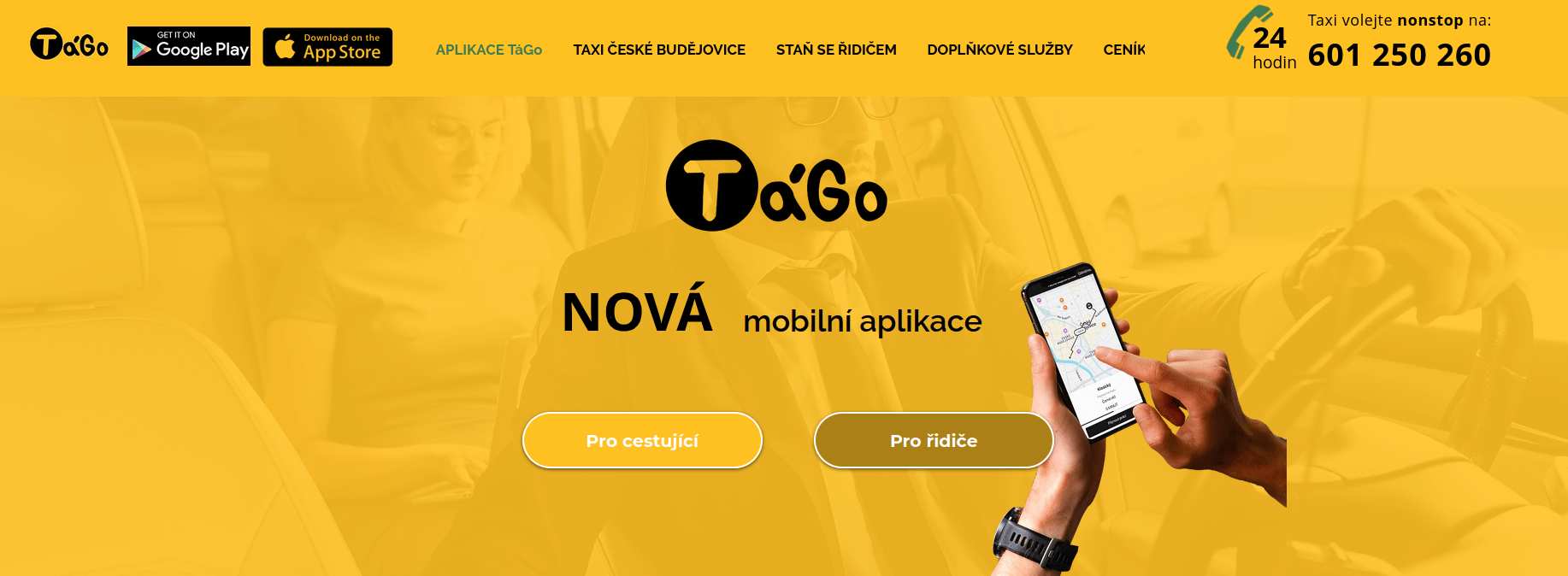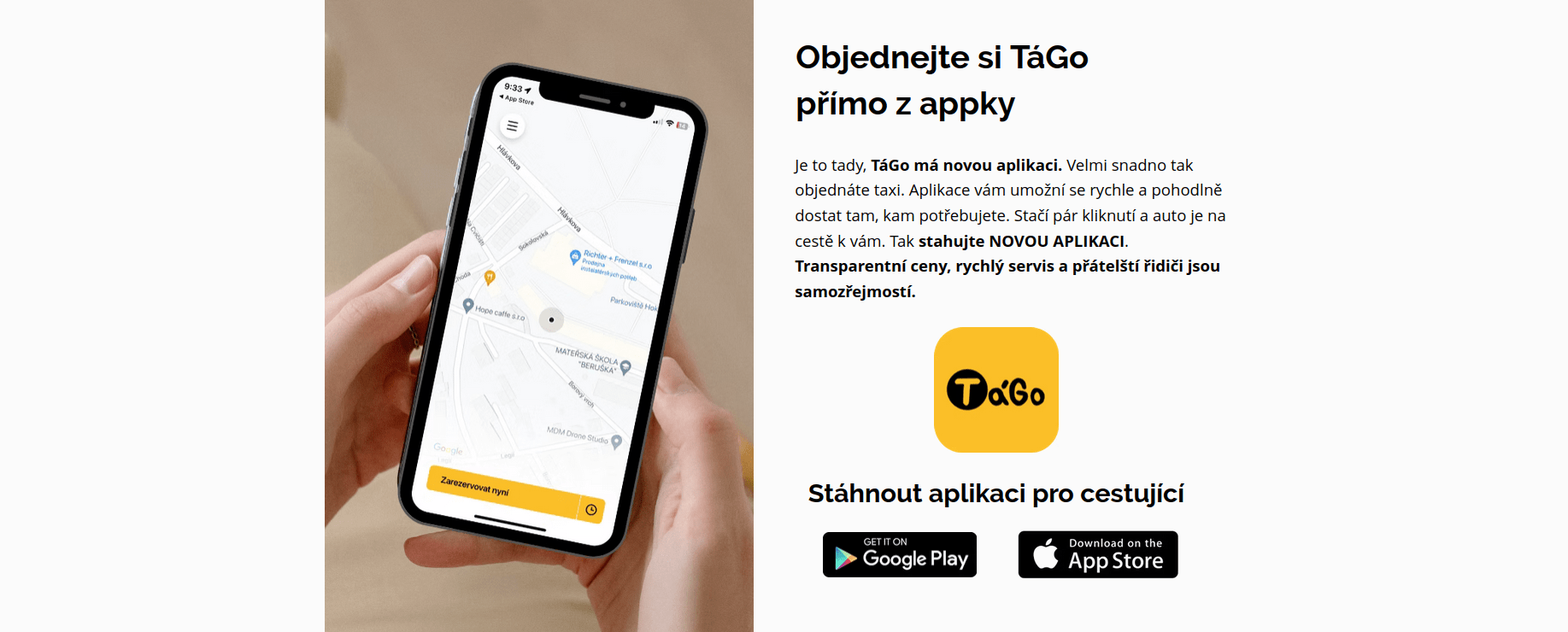 Je to tady, TáGo má novou aplikaci. Velmi snadno tak objednáte taxi. Aplikace vám umožní se rychle a pohodlně dostat tam, kam potřebujete. Stačí pár kliknutí a auto je na cestě k vám. Tak stahujte NOVOU APLIKACI. Transparentní ceny, rychlý servis a přátelští řidiči jsou samozřejmostí.