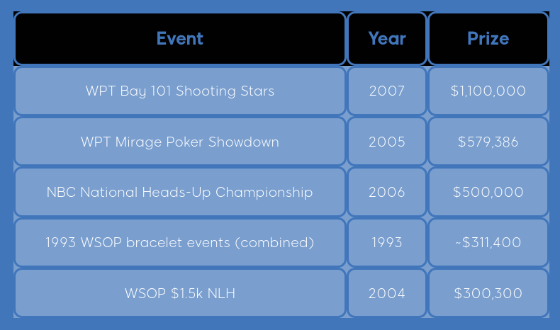 His largest single prize came not from the WSOP but from the 2007 Bay 101 Shooting Star. He won $1,100,000 after the longest heads-up match in WPT history.