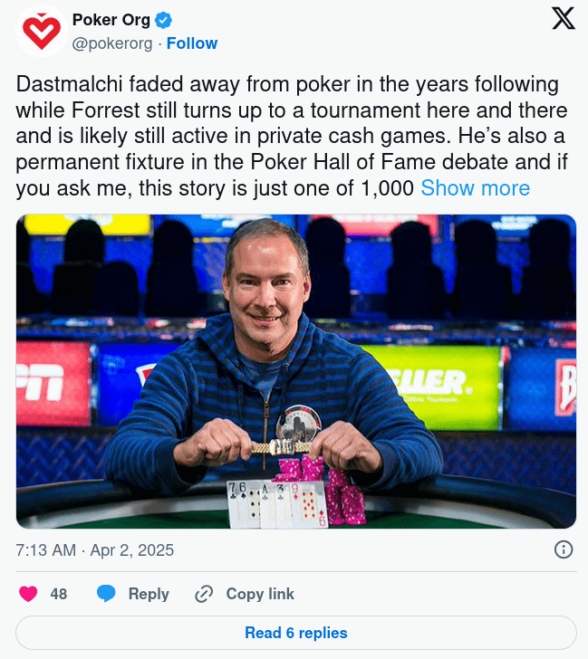 John Hennigan published an op-ed in 2025 arguing for Forrest’s induction into the Poker Hall of Fame as one of the best poker players of all time. The piece drew attention partly because Forrest had made no such case himself.