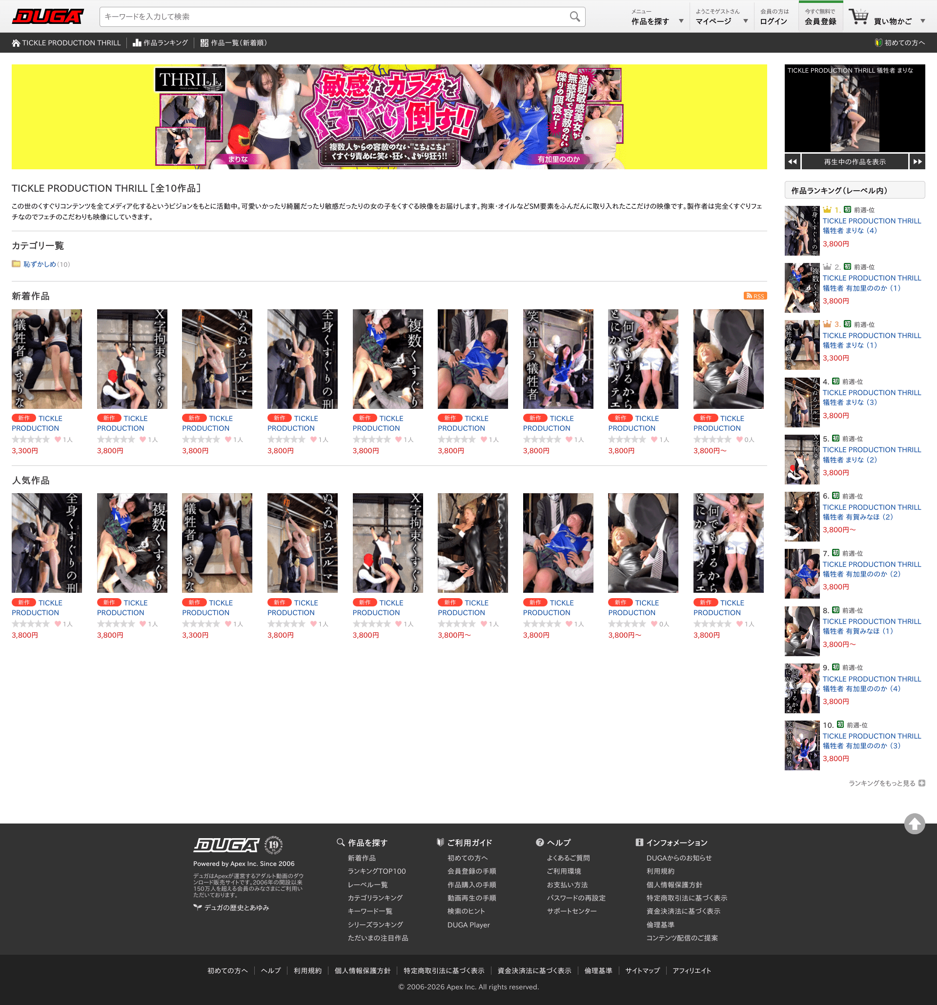 この世のくすぐりコンテンツを全てメディア化するというビジョンをもとに活動中。可愛いかったり綺麗だったり敏感だったりの女の子をくすぐる映像をお届けします。拘束・オイルなどSM要素をふんだんに取り入れたここだけの映像です。製作者は完全くすぐりフェチなのでフェチのこだわりも映像にしていきます。 TICKLE PRODUCTION THRILL 2026-03-12