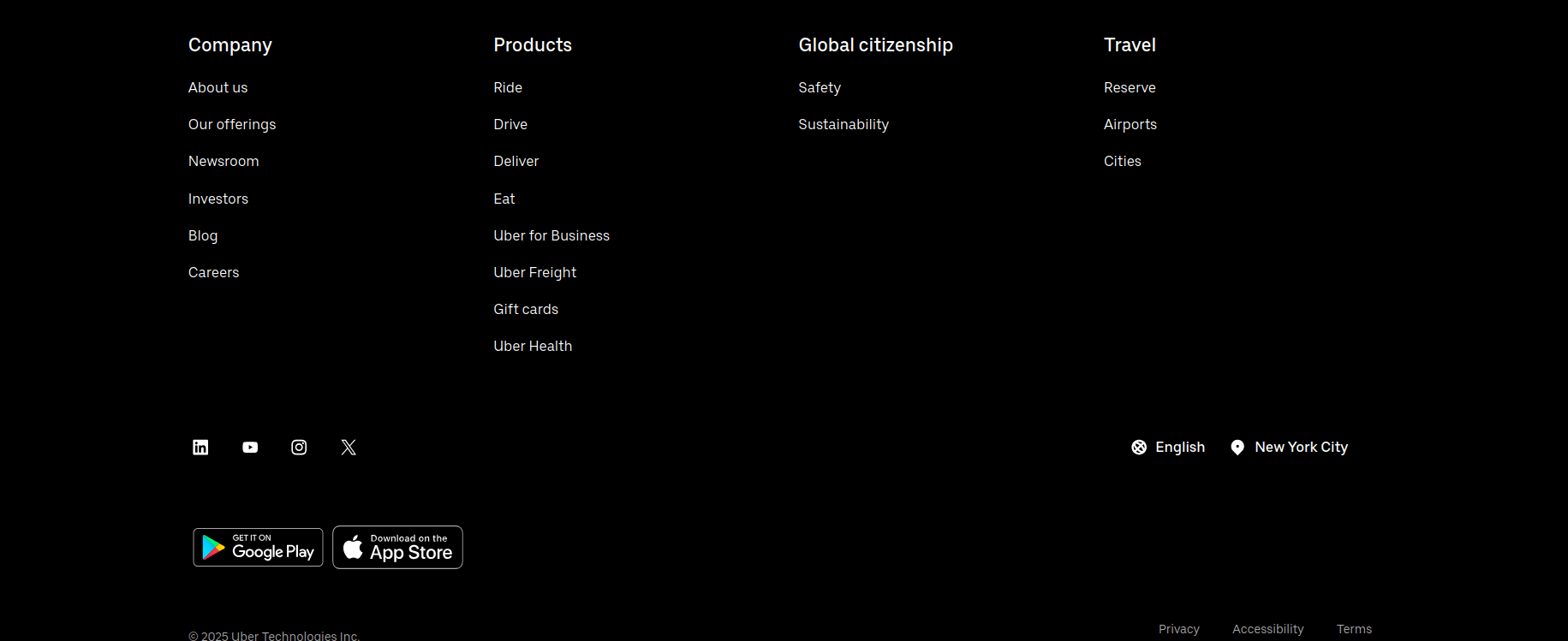 Uber Technologies, Inc. is an American multinational transportation company that provides ride-hailing services, courier services, food delivery, and freight transport. It is headquartered in San Francisco, California, and operates in approximately 70 countries and 15,000 cities worldwide. It is the largest ridesharing company worldwide with over 180 million monthly active users and 6 million active drivers and couriers. It coordinates an average of 36 million trips and delivery orders per day, and has coordinated 64 billion trips and delivery orders since its inception in 2010. In the second quarter of 2025, the company had a take rate (revenue as a percentage of gross bookings) of 30.6% for mobility services and 18.8% for food delivery.