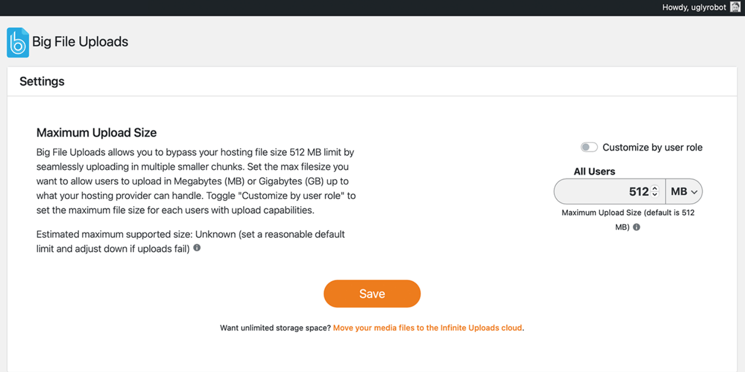Enable large file uploads in the built-in WordPress media uploader via multipart uploads, and set maximum upload file size to any value based on user role. Uploads can be as large as available disk space allows.